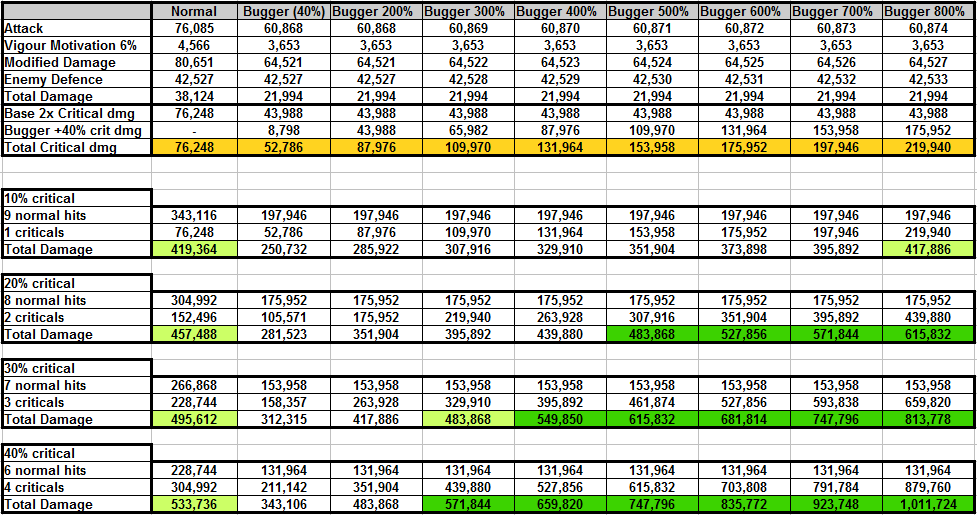 You do make some good points, when I looked at spermcaster I only considered red and white, as most of the other girl skills are somewhat questionable. Alltho when thinking about it, a blue spermcaster is probably quite good too. The problem (as you pointed out in your post) is that the mana goes to two random girls, a sexomancer does not use mana unless she can revive. 1 sexomancer is 14.2% of your team, while running 2 sexomancers would mean 28.5% of your team does not need mana (if things are going to plan) I seem to remember you cannot save up mana; as a girl will use all available mana, even if you exceed 100. Don't quote me on this tho, if I am wrong and mana saving is a thing, then green could be quite useful. Red (eccentric) seems strong, more burnout for more damage. White (submissive) seems strong too, extra healing to stabilize the frontline early on when you need seems good to me. Blue (sensual) Can't go wrong with shields, still random who is cast on, but better chance with more casts. Black (domi) One extra attack each 3rd round (critical if 5 bulbs) Basically 1/3 more attacks. Seems fine, but red probably better overall Yellow (playful) Stun is unreliable, more unreliable stun is still unreliable. Purple (Voyeur) Mana drain still bad. Green (exhib) A lot better with spermcaster then a normal girl. Is reliant on mana going to a girl you need it on. Unshure how it will work in practice as its highly dependent on the team, and what girl gets the mana. High Variance BUGGER ANALYSIS After my testing last night I decided to take a closer look at the bugger role, It's really bad, but I just wanted to see just how bad it is. So first of all, the reduction in attack is very bad, because all damage numbers are based on this one stat. Having a lower attack means that more damage is blocked by the enemy's defence, since critical is calculated after enemy defence, it makes criticals do way less damage. It's also worth noting that since the enemies is scaled towards your best girls, you will face girls with really high defence towards the end of the run, the final boss on hard mode will have 215-225% the defence rating of your best girls. Your bugger girls will do bugger all against the boss. I've setup a spreadsheet to compare a normal girl against bugger girls with the same attack level, but with different levels of critical damage added to them, just to see how bad they are. Normal critical rate in the laby is 15% dependent on harmony, higher harmony gives you more critical and lowers the enemy critical. To simplyfy I am not going to use harmony in this example apart from the first 10% critical test. 10% critical; if you pick up no critical chance % relics or harmony relics, you will fall behind in critical chance, on hard mode you will be below 10% on the final boss. For a bugger girl to break even in damage against a normal girl with 10% crit, her critical damage would have to be increased from 40% to 800%. 20% critical (1 legendary crit chance relic) A bugger would need 500% critical damage in order to do slighly more damage then a normal girl. 30% critical (3 legendary crit chance relic) good luck with that A bugger almost breaks even at 300% critical damage. 400% does slighly more then a normal girl. 40% critical (5 legendary crit chance relic (more like 6 due to harmony)) Welcome to fantasy land. A bugger would need 300% critical damage to do slightly more damage. These are numbers against a hard laby floor3 normal (yellow) fight. These do not represent damage against a boss, I have not done the calculations, but I assume her damage will be too low to even get a hit in. Suggested changes; Remove the attack debuff and give her a base +200% critical damage bonus. Or Give her an innate +10% critical chance and give her a +100% critical damage bonus. I think anything less then this would make buggers unusable in the laby, especially with so many better options to pick from. -