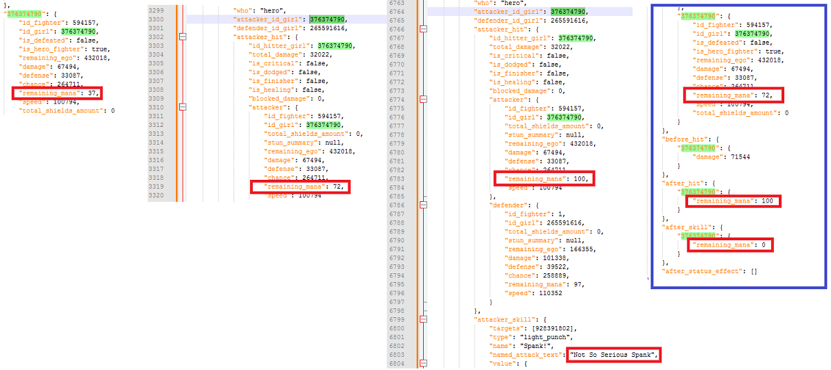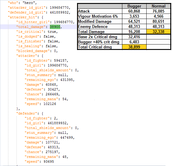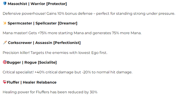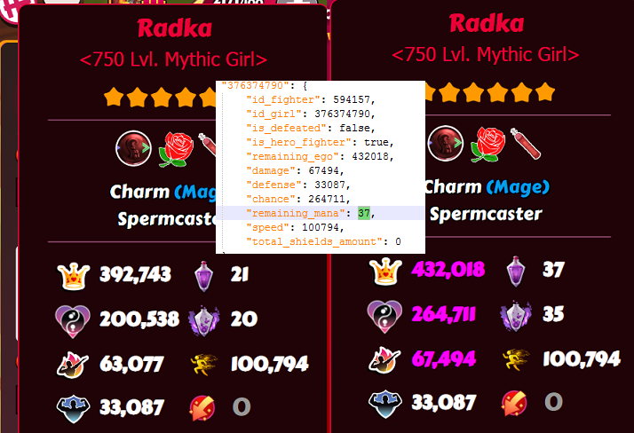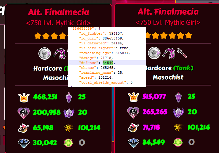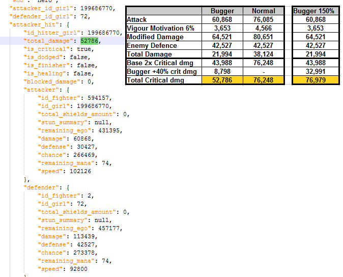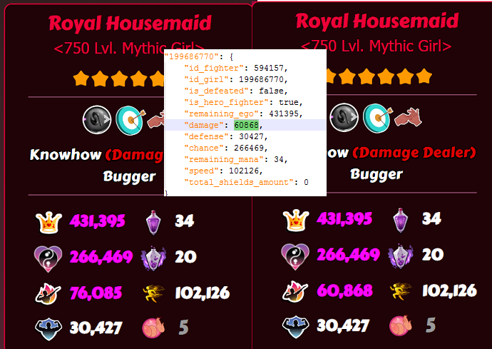 Okay, I've done some testing on the new roles, I have some good and some bad news. I'll do them in the order on the list from the patch notes. Masochist - 10% Defence Bonus. Finaltits normal defence goes from 30.042 to 34.549. That is an increase of 15% instead of 10% 10% would have been : 30.042*1.10 = 33.046 15% makes it to be : 30.042*1.15 = 34.548 (rounded to 34.549) No defence relics obtained when test was done. Verdict - 5% more defence then advertised. Not sure if it has interactions with other defence relics, could be something to come back and check later. Spermcaster - 75% more starting mana and regain. Radka's starting mana and regain Does increase with 75% each. Starting mana 21*1.75 = 36.75 (rounded up to 37) Regain mana 20*1.75 = 35. Here are the Json data, she starts with 37, round 1 gains 35, adds up to 72. round 2 gets to 100 and uses skill. Verdict: This might actually be super strong. Normally girlskills is cast at round 4, then each 5th round. This makes the first cast start at round 2!! and is then cast every 3rd round. By the time a normal girl casts her second, a spermcaster has already done her 3rd cast. When the normal girl casts the 3rd time, the spermcaster does her 5th. An Eccentric spermcaster seems quite lethal. Notable eccentric spermcasters; Radka (mythic) Atina, Zuzanna (legend) Metal Noemy (rare) Corkscrewer - Targets lowest ego girl. Tested and confirmed, does not care about positioning. Will hit the lowest ego girl regardless of her position. Verdict - Application seems niche, unshure how to use this effectively; synergizes with Finish Move. Bugger - +40% critical damage, but -20% normal hit damage. This is where the good news end, Housemaids attack is reduced by 20% 76.085*0.8= 60.868 Because the way damage is calculated, a lot of the damage is blocked by the defence. The added critical damage does not make up for the loss. Damage formula: (Girl base attack + damage increases) * Vigorous Motivation/Berserk = Modified Damage Modified Damage - Enemy Defence = Total Damage. If crit, then multiply Total Damage 2x. If additional critical dmg relics, adjust number accordingly. (50% extra critical dmg = Total Damage*2.5) Example 1: This shows a Bugger housemaids critical damage vs a normal housemaid attack. Only 20% extra damage on the critical vs a normal attack. Example 2: This shows a Bugger housemaid critical vs a normal housemaid critical. Even tho the bugger has 40% extra crit damage, the raw damage from normal housemaid crit is 45% stronger. To produce equal damage numbers, I had to increase the Bugger critical hit damage bonus from 40% to 150% Example 3: This shows a Bugger housemaid regular attack vs a housemaid regular attack. Normal housemaid does 86% more damage then the Bugger. Fluffer - Fluffer heals for 30% less. I had 2x90% dodge on my frontrow girls. I did not take enough damage to accurately check the healing. TL;DR. Masochist - 15% defence instead of 10% Spermacaster - Works as intended, seem very strong with a eccentric girl. Corkscrewer - Works as intended, ignores girl placement. Bugger - Reduces base damage, making her do much less damage, completely useless. Fluffer - Needs additional testing. Edit; Uploaded better pictures for examples, I've separated out critical damage in case someone wants to do the math. -