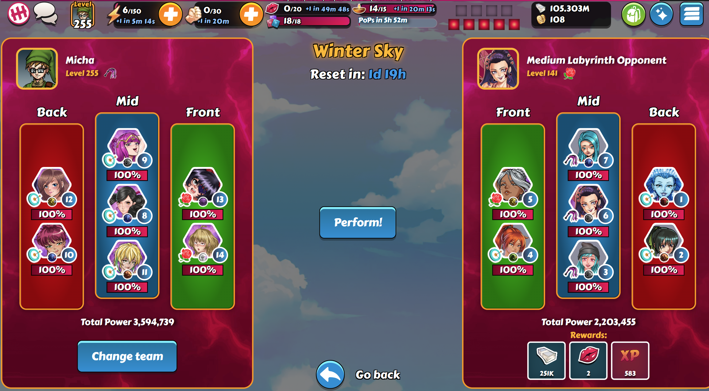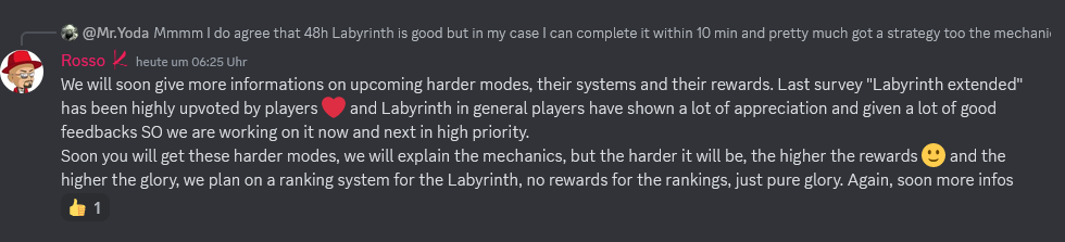 Of course you need additional time for additional floors. I learned how to play the Labyrinth with all its bugs and quirks, but clicking through the 3 floors, in case adjusting the team by times, depending on opponent, choose the path and the relics, all this costs time. In current easy mode, when not bothering wasting some girls on the way, you might to it in 15 minutes, but with harder difficulty, or when you aim to get max rewards by choosing the hardest opponents, 30 minutes are realistic for 3 floors. The DGs for a feature which can be played just limited is a dedicated issue. I had 3 of them on 1st day those were added. Those are prevented when you cleared the Laby the previous day, but I can imagine that you could still run into unsolvable goals when e.g. clearing all but the last boos on 1st day, or only a small number of remaining opponents. So it is at least not without any problems. However, I am fine with it since it means that "get a new girl", "restock the marked" and such annoying goals are less likely. I remember when I entered D3, the first weeks it was indeed often impossible to solve these goals, when they appear on last league day, where only the hardest opponents with moreless assured losses were left. Luckily I win most or all league battles nowadays. What I did that time is to keep some weak opponents unbattled for the last day. In seasons of course such does not work, but I never had issues winning in seasons.1 point