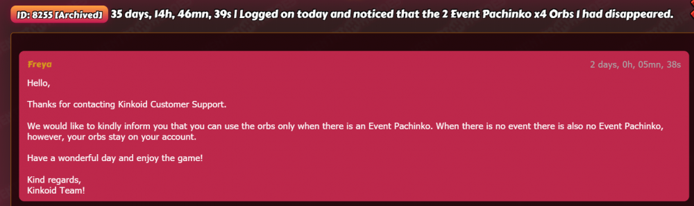 What is the point of the support system if it takes so long to get a response that is absolutely useless and they arbitrarily close it? Been playing for nearly 3 years, and they just thought . . . I mean I'm not even sure what they thought, since both when I reported the issue, and when they responded over a month later, there was an event going on... However more importantly, what did they think I meant by my event orbs disappearing? I didn't say "The event pachinko disappeared"... I would have been less annoyed if they just said "Huh, oh well nothing we can do. Sorry." Guess in the long-run I'm lucky, and the bug I had came from something I didn't spend money on. Guessing had it been w/ one of the packs I bought over the years, I would of just been SoL. Overall, I give the Costumer service 2/5 - At least they responded. But them replying with a random fact about Madagascar would have been just as helpful.