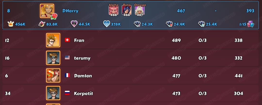 I unexpectedly took third. I looked at the competition and kinda gave up, also having a very busy week and no time to play. I ended up having to do 60 fights, yes, 4 full refills with x15 button. Still got 22,3 average with 6756. Not as much as I can/could have, but apparently not terrible in this table either. I'll take the unexpected third. One and two were miles away so maybe their presence demotivated some of the others like Troctout suggests. -