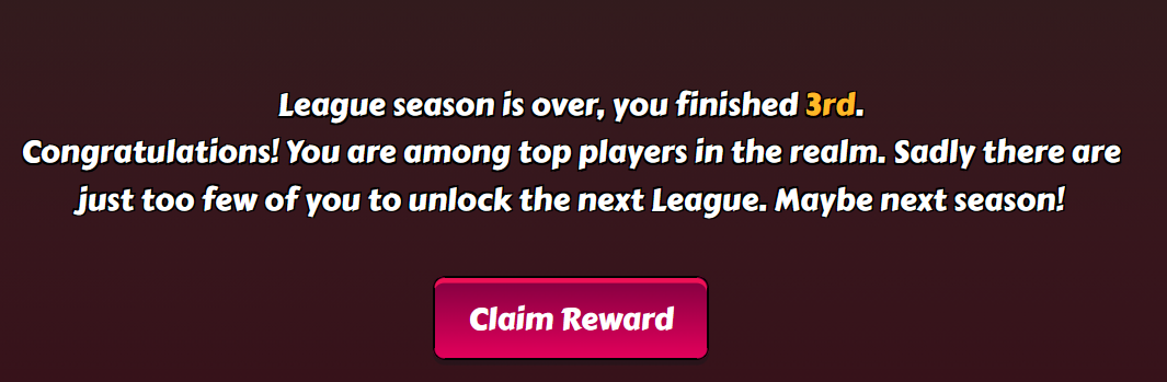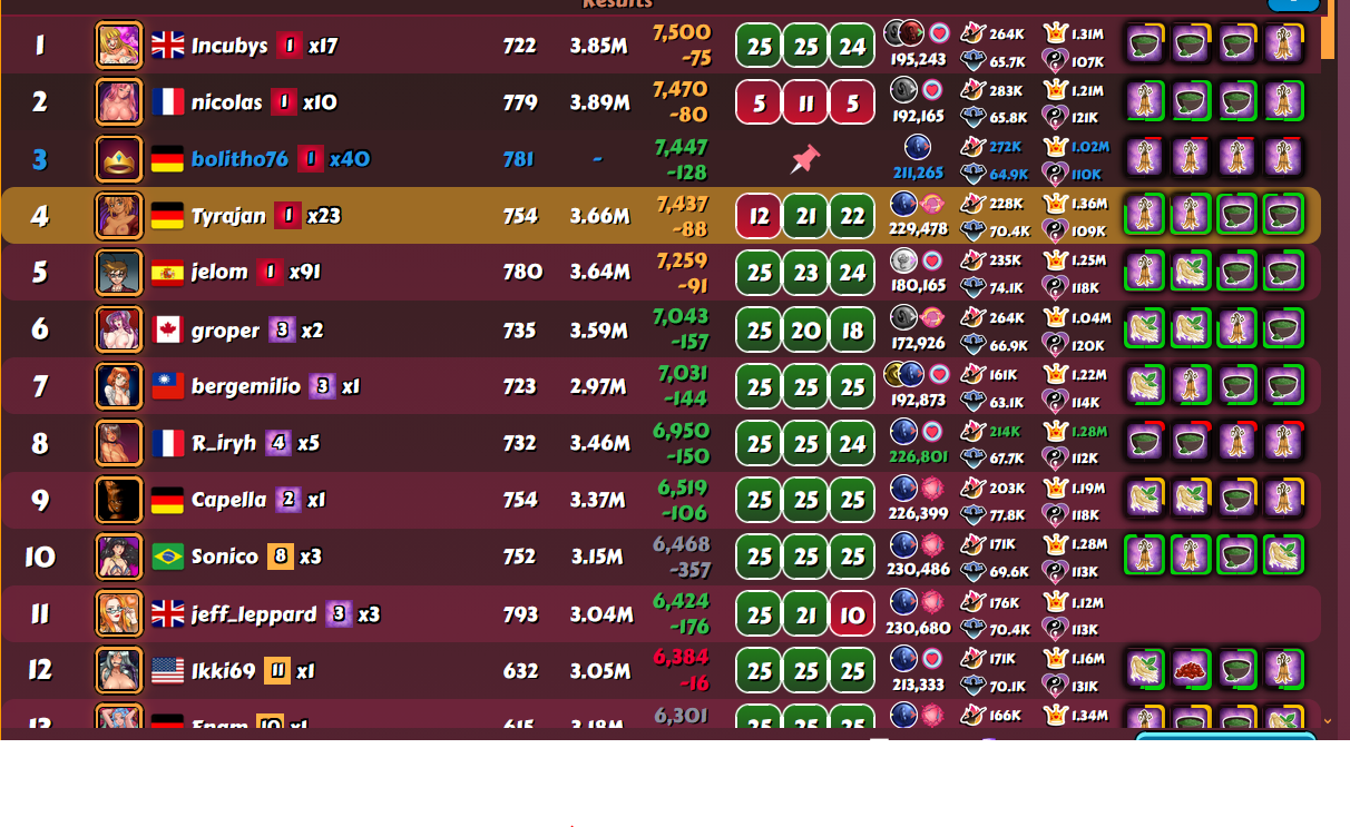Sadly I was literally seconds to late to catch nicolas unboosted - as Iopend the League, he was fully unboosted, but I recognized after the first fight, that he must have reboosted in the time I need to start the fight. Even I had a chance abvoe 60% to beat him, all 3 fights got lost and two of them with the minimum of points I could gain. In combination with the fights against jeff_leppard and Tyrajan I lost so much points, that I should have lost my top4 ranking. But somehow I survived at 3rd place. Seems, that Tyrajan and jelom hadn't done their last fights or have lost more points than I had tracked.
