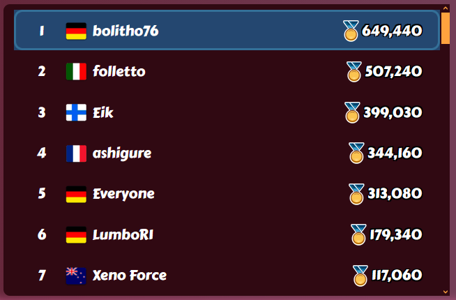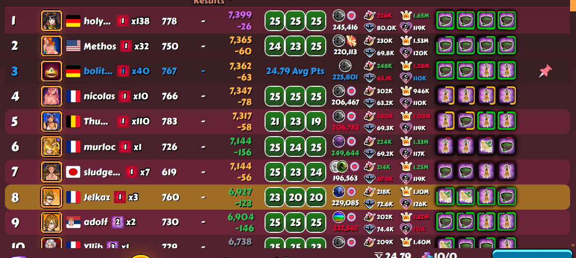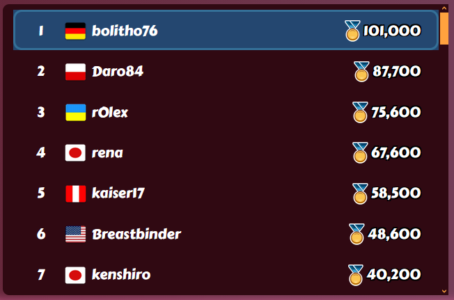 Gratulation to holymolly for his win! Until this morning I had chances for 2nd place (1st if holymolly had some bad luck after he was far from finishing his fights) at the time I had only Mehtos and Jelkaz left to fight. With 48 points lost I wasn't in a too bad postion. While I could catch Methos unboosted and had a mostly expected outcome (24,04 expected) and so "only" 3 points lost, I was litreally seconds to late to catch Jelkaz unboosted and had to fight him boosted. Result: 12 points lost and that let me end 3 points behind Methos. -