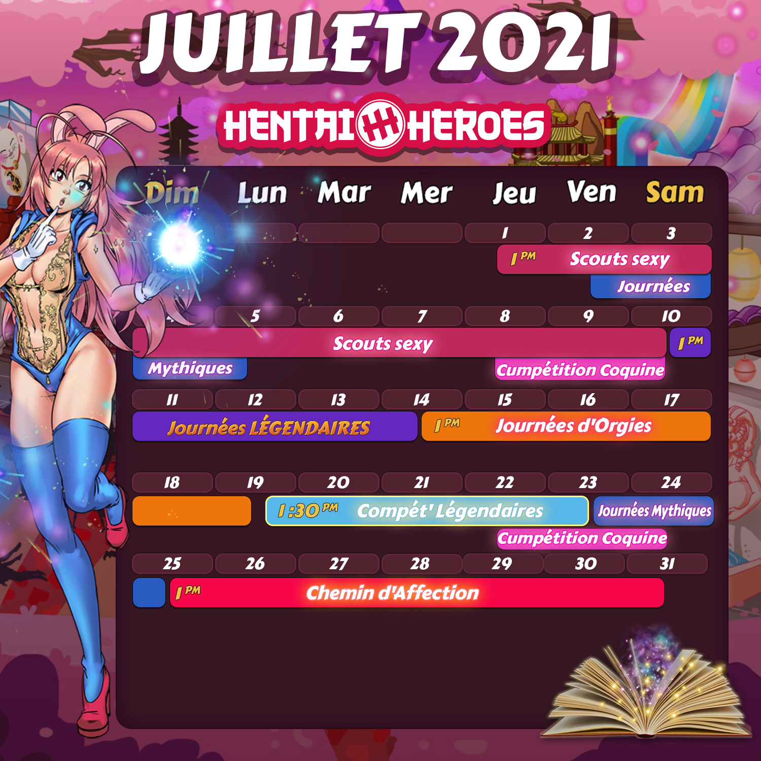 Évènement classique : Scout Sexy Du 1er au 10 Juillet (1:00 p.m. GMT + 2 à 1:00 p.m. GMT + 2) Tu as été choisi pour être le nouvel animateur du camp des scouts sexy ! Les filles sont prêtes à tout pour obtenir leurs badges ! 7 filles seront à retrouver depuis le Pachinko, 3 d'entre elles seront à récupérer auprès des trolls, 1 fille sera obtenable en complétant les Missions Journalières. L’étouffante orgie d’été À partir d’aujourd’hui et jusqu’au 19 juillet (13 h UTC+2), tu as cinq jours pour obtenir plus de 28 séduisantes jeunes femmes ! Elles ont enfilé leurs maillots et sont prêtes à se mouiller pour toi ! Le gang bang s’annonce sauvage avec les nouvelles : Vechta d’Été et Ria de l’Espace. Compét’ Légendaires À partir du 19 et jusqu’au 23 juillet (13 h 30 UTC+2), tu auras quatre jours pour obtenir l’éblouissant MoMo ! Il y aura 4 Compét’ Légendaires à remporter pour que cet amant féroce rejoigne ton Harem. Mythic Days Dès maintenant et jusqu’au 25 juillet (13 h UTC+2), tu as 72 heures pour obtenir l'insaisissable Bunna. Cette créature mythique se révèlera à toi toutes les 2 heures ! Chemin D'affection À partir d’aujourd’hui et jusqu’au 31 juillet (13 h UTC+2), tu as intérêt à sortir ta grosse épée de son fourreau pour ces 4 sublimes gardiennes.