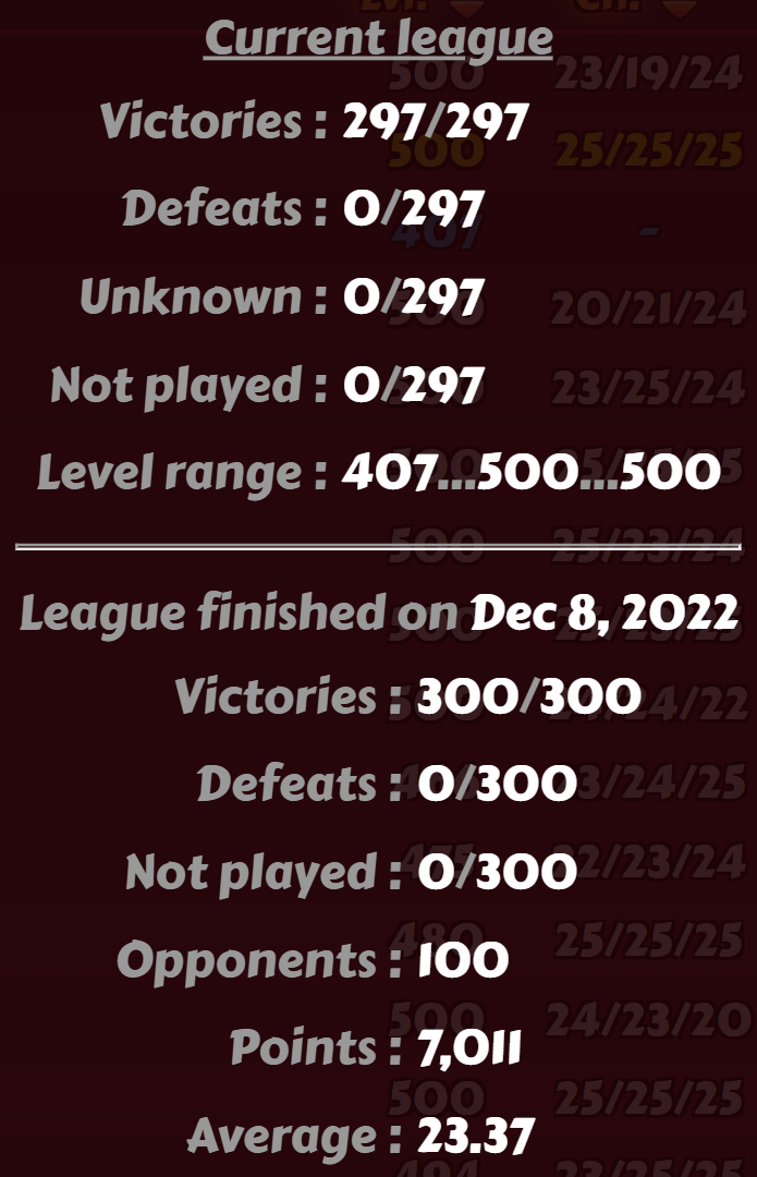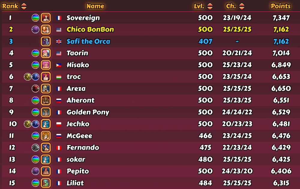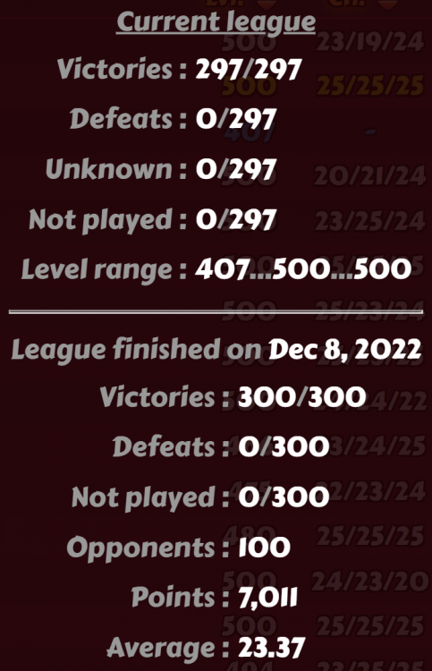 Fun and challenging league this week, with fellow club mates @Liliat, @Chico BonBon and @Taorin all in on the action! It was clear that Chico and Sovereign were going to be vying for the top spot, my money was on Chico until it became obvious that Sovereign was doing an incredible job of tracking everyone's league progress with detailed knowledge of number of fights etc. So when Sovereign knew she'd done enough to be victorious, she had no problem switching to weaker boosters safe in the knowledge that 1st was hers I finished the league with a 24.11 average across 297 fights, final score 7162. The usual boosters for me, 3 x cordyceps and an All Masteries Emblem active. Full class-matching mythic gear, no theme bonus this week (that'll change soon, got my first class-matching balanced theme attack/defence piece of equipment a couple of days ago). I was surprised how much higher my average score has been with this league. Compared to the 'easy' D3 the week before, I expected a lower average due to fiercer competition. Anyhow, obligatory screenies! -