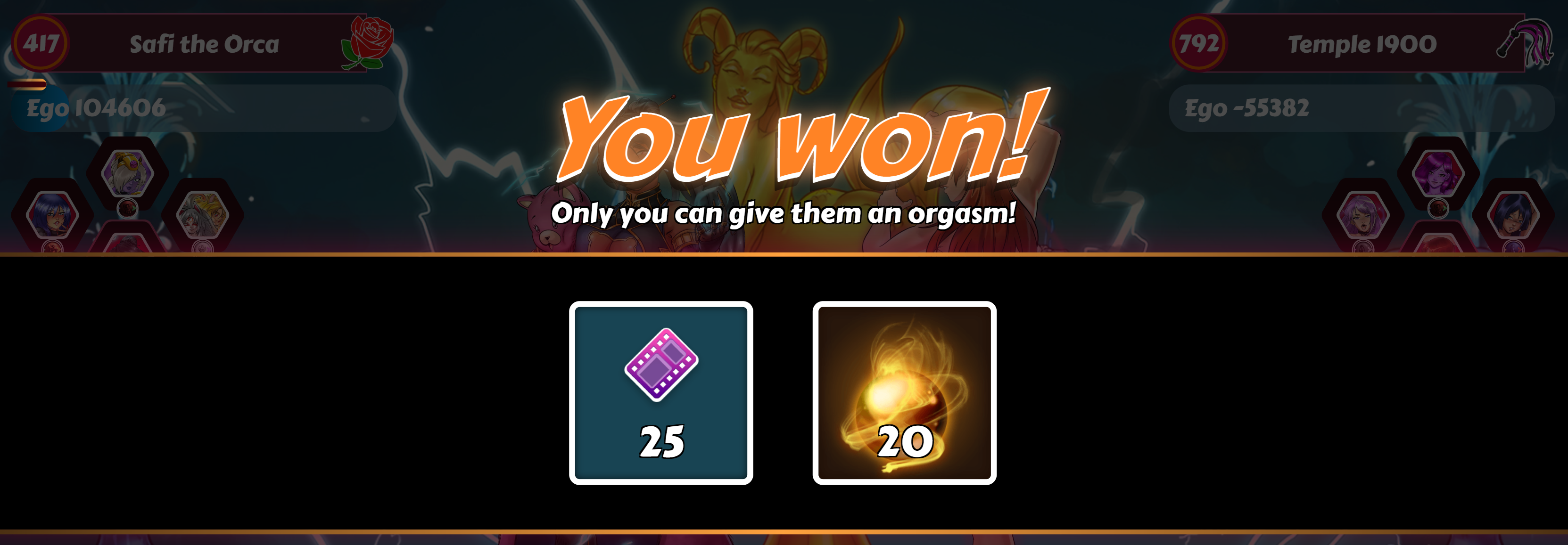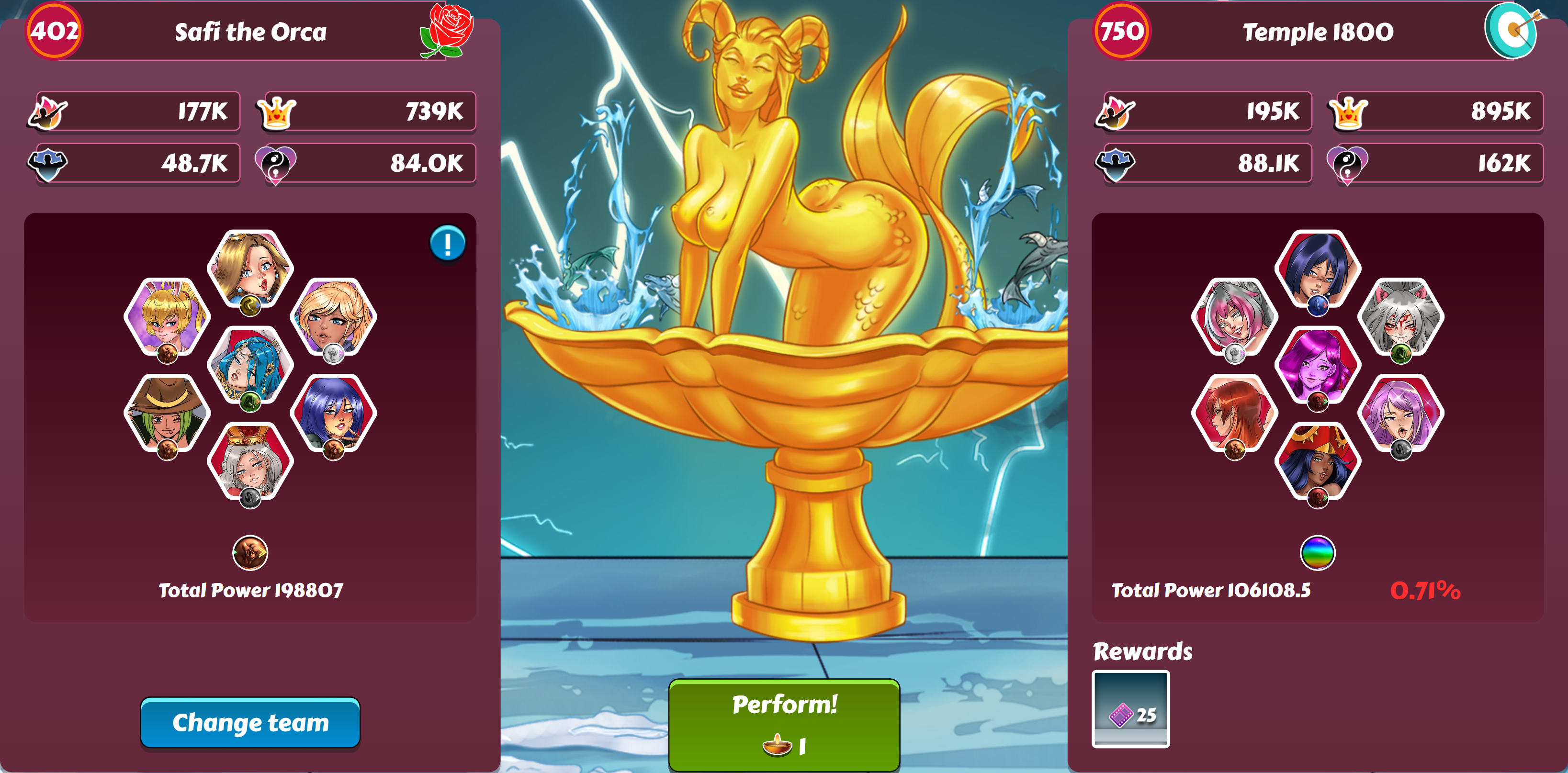 This was a deliberate attempt at breaking through Pantheon 1800 - after all, how could I pass up the opportunity after the amazing luck of my club mate with the current blessings? Usual story, 3 x cordyceps, new headband applied. I now have a full suit of mythic equipment, all class-specific (Lover/Charm in my case). All girls awakened and levelled to 750, fully upgraded with affection. Themes for the pieces are 1 x orange (physical) 2 x blue (sensual) 1 x yellow (playful) 1 x white (submissive) 1 x black (dominatrix) Active bonus from mythic gear are 8% attack (4 x class matches) 4% ego (2 x class matches) 4% harmony (1 x theme match) These are my stats according to the player profile page. So here's the first team I weighed up against Pantheon stage 1800. This is currently my strongest team, and rainbow (which is the usual recommendation for tackling a pantheon wall). I compared with my other teams, and found that even with a slightly lower total team power, my orange (physical) team was offering better odds. I was ready for the long haul - fully expecting to burn through 100 or more worship. It wouldn't be an issue, I had 224 left despite recently breaking through 1500, 1600 and 1700. Inevitably this happened! The best part? It only took 22 worship