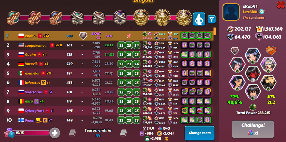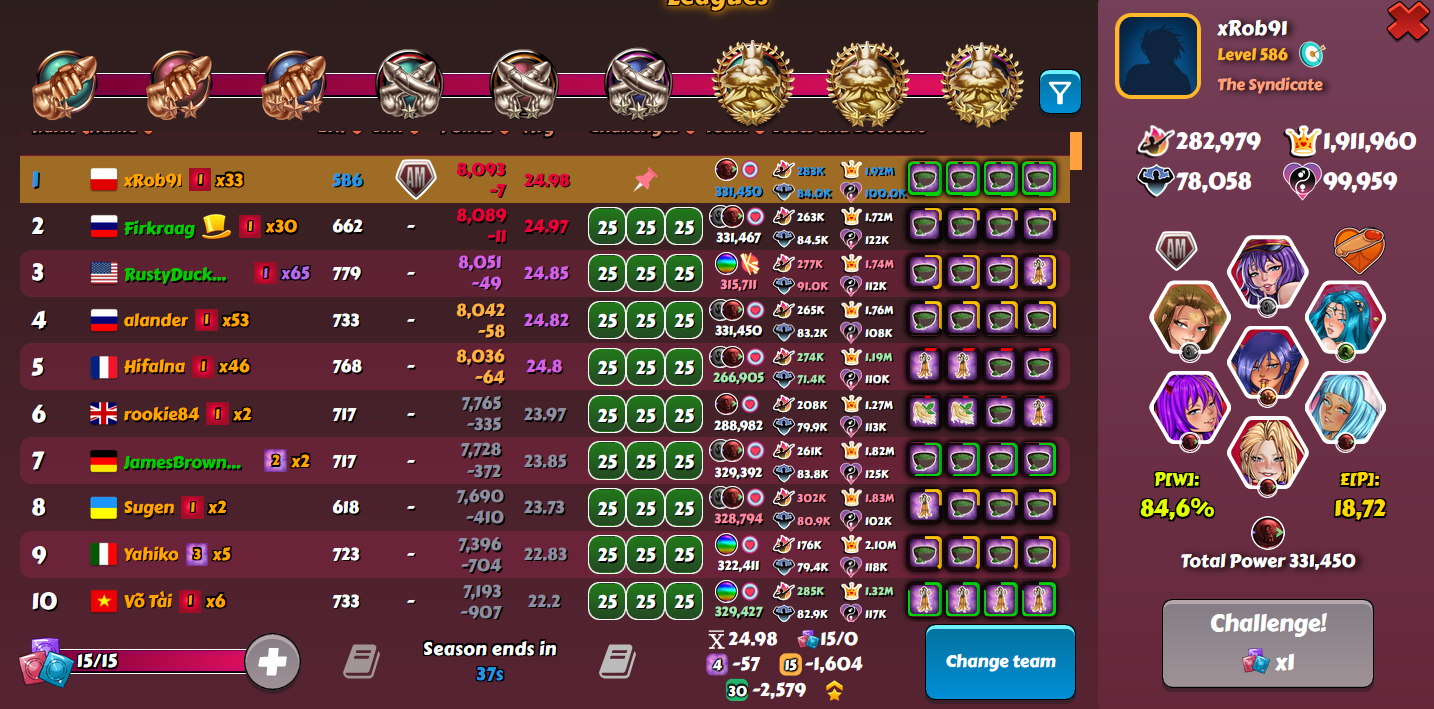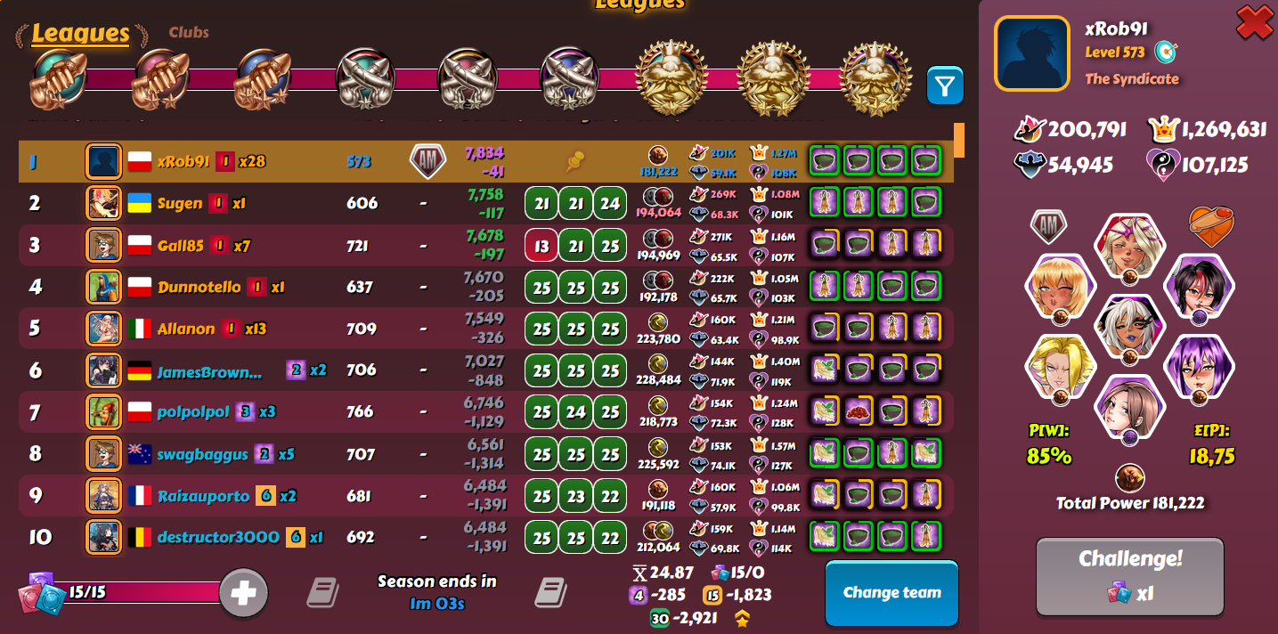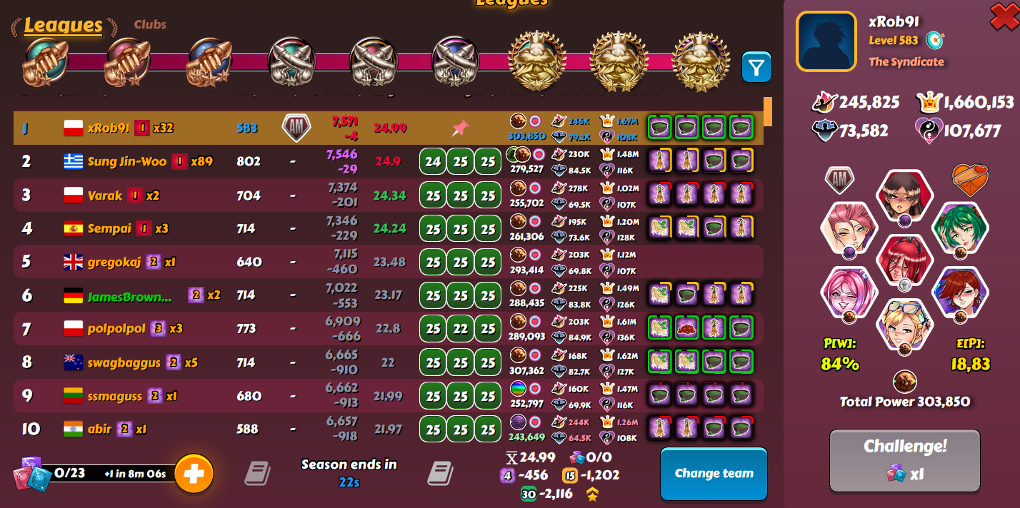I shouldn't have won this but RNG decided otherwise. I didn't have big expectations in this league because my team for the 2nd part wasn't optimal. I still did most of the fights on Monday to not care about league much the next days. Unluckily for Firkraag, he lost 7 points from 2 guys with ~24.8 expected which made my win possible. I also got 75 from 2 last guys, with 24.52 and 24.75 sim score, so luck was definitely on my side (unfortunately balanced by terrible luck in MD) -
