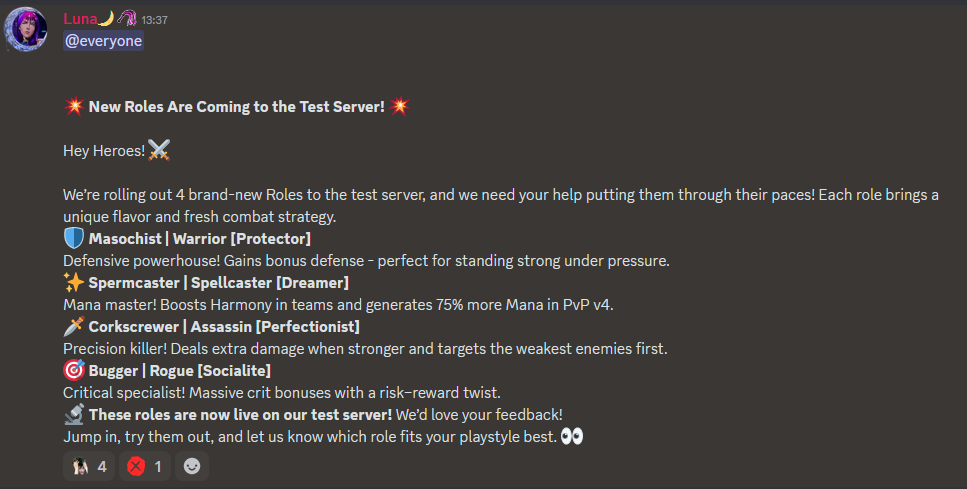 #NewRoles -> 1 kiss, 5 Epic Pachinko x10 orbs works only on test server