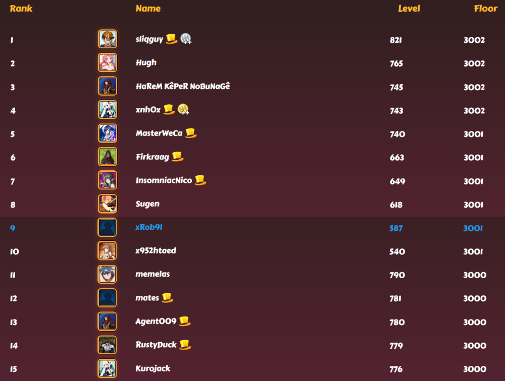 I guess another big milestone after floor 3000 is... 3001. I equipped headband I got for free for reaching level 580 and beat floor in 4th try. I had 8.2% win chance. Now I'm in top 10 on Nutaku ranking, though I'm not sure for how long it will last.