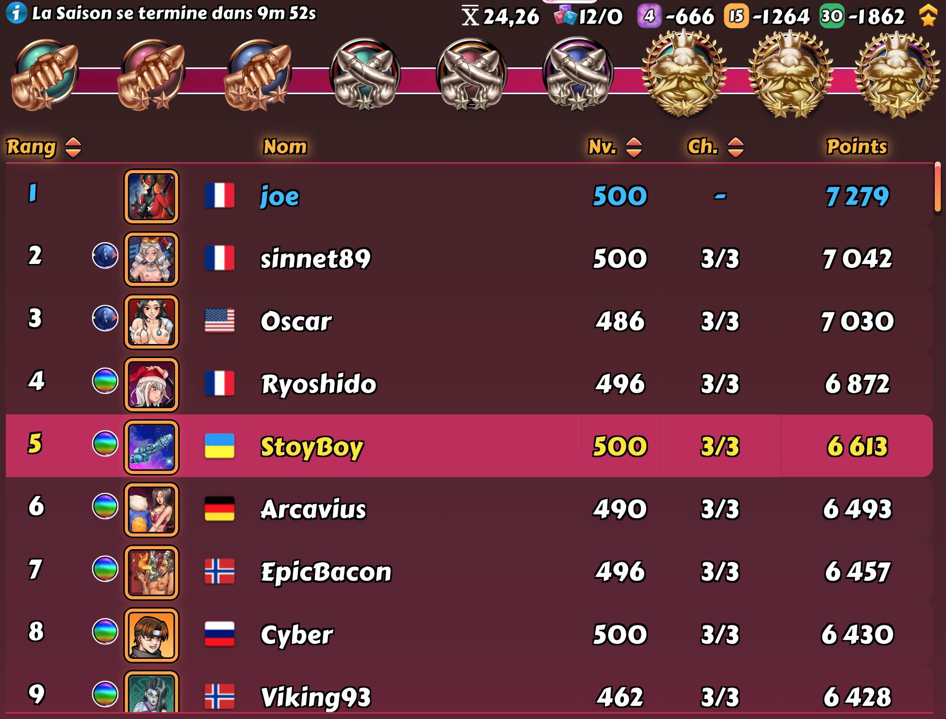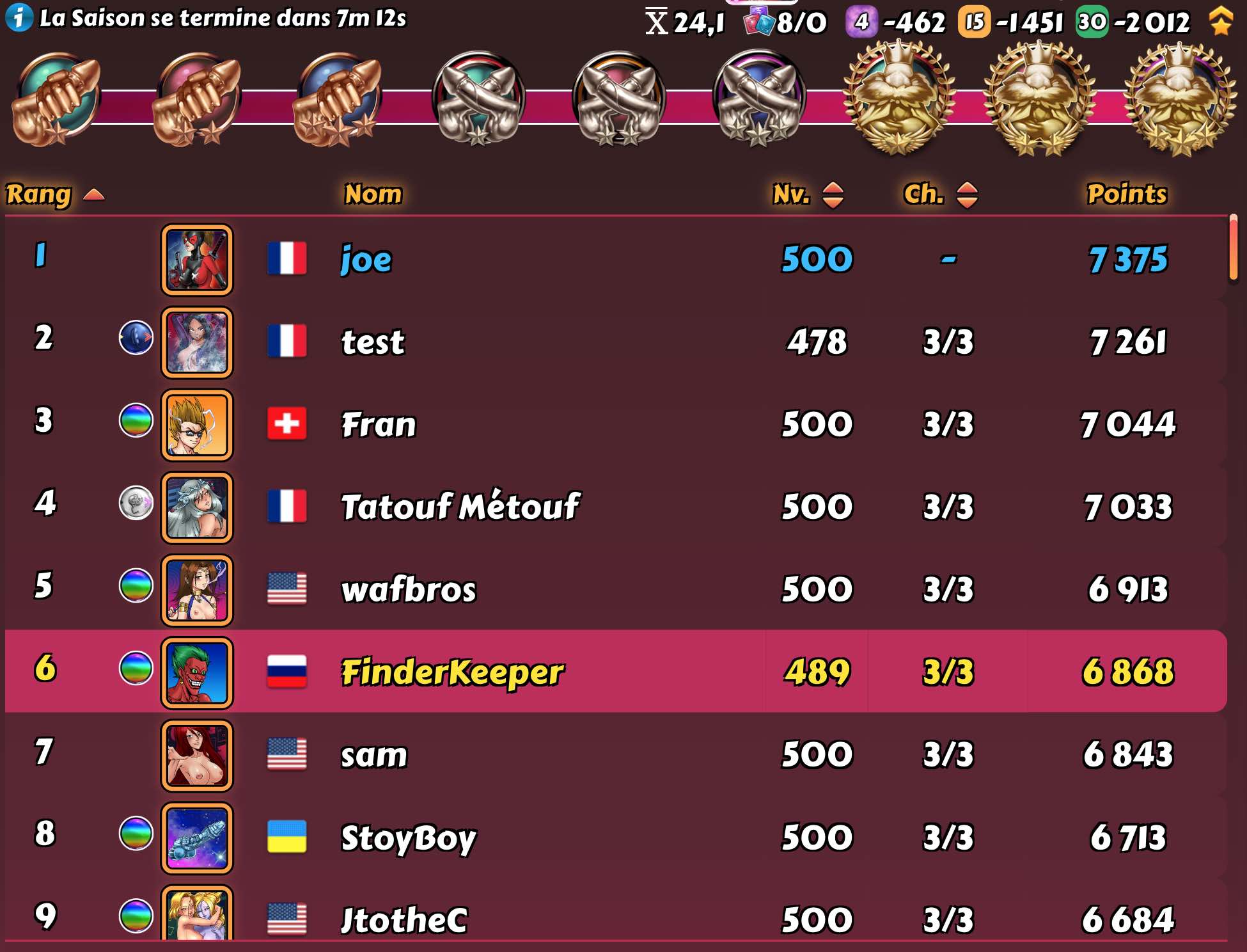 Another week at the top... Please, don't change anything... that old cowboy is getting used to the celebration at the saloon after all these duels... the ladies are always so charming ^^ All in all, Fran and Tatouf weren't my real adversaries there (they probably didn't even try), but Test was hidden far below the veteran horde, and snaked his way to the top, thanks to his youth and a very impressive 750lvl team of determined ladies... But well, one needs more than juvenile vigor and overzealous ladies to take on the weathered Marshall... Final results show that the Deputy still has the 'golden finger' ^^ Let's keep it that way for a little while longer, shall we? -