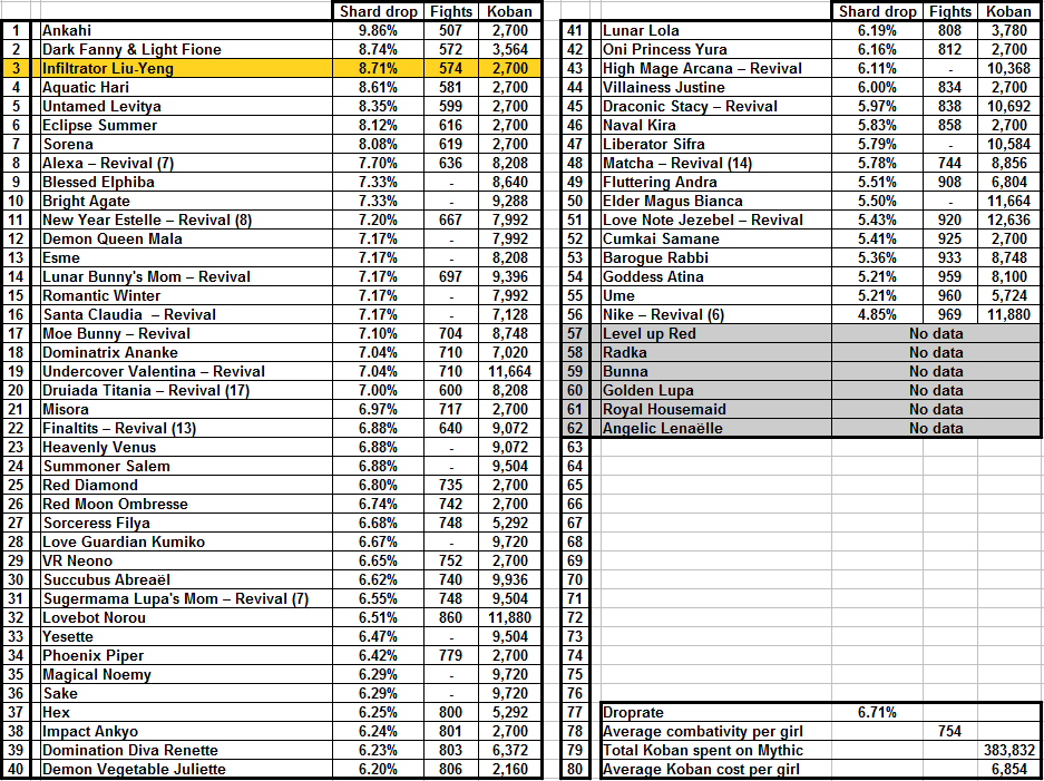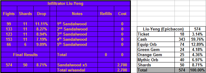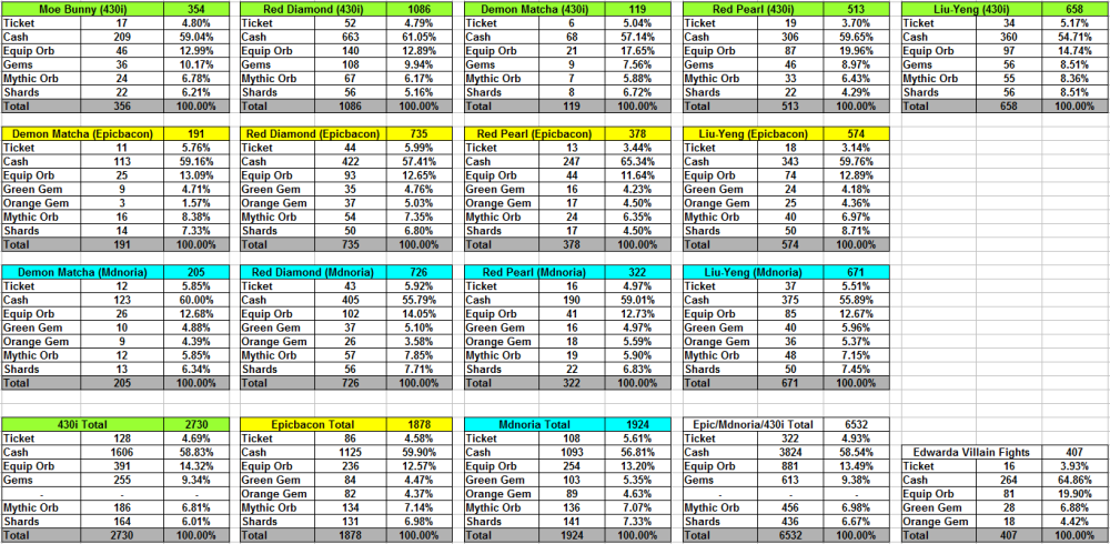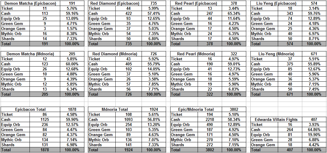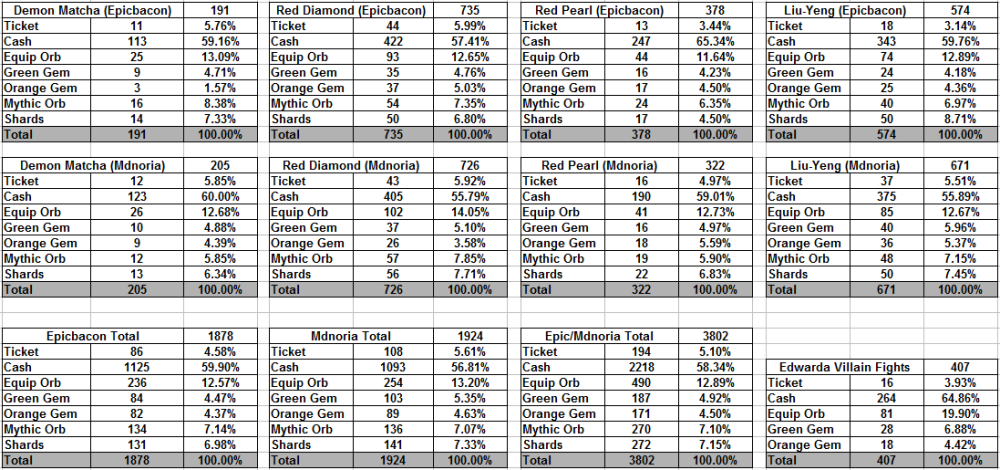 Went over my and @mdnoria's drops for the last 4 mythic days/revivals to get a better look at the droprate for equipment orbs. Very similar droprares. I've also combined or event drops and compared them to my 407 non event fights with Edwards where no mythic orbs are in the pool. My non-event droprate for equipment orbs is 19.90% and the total equipment/mythic orb in events comes out to 19.99%. Based on this data, I estimate equipment orbs drops on Edwarda at 20%. (since Nike has the same droptable, its likely Nike has the same equipment orb drop%) In an event where mythic orbs are present it changes into a 13:7 ratio (65% equipment orbs / 35% mythic orbs) Update : @430i provided his dropdata, and I've created a new table to include this data. 430i's data did not seperate the different gem drops, so for the final total I added both different gems together under "gems" Gem drop is consistant, 430i has 9.34% while Mdnoria and I had 9.42% combined. Minimal changes, equipment orb chance goes slightly up, while shards go slightly down.