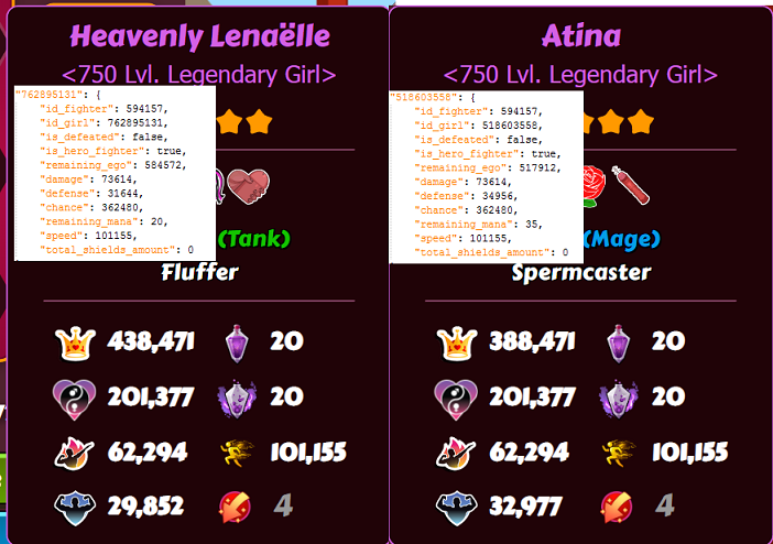 I don't think I read this properly at the time, but I looked over it again and realized that if you have two girls with 100% dodge, then the shields will not really contribute much at all, as all attacks will get dodge. The only problem would be enemy girl skills that bypasses dodge relics. I've been running 3 fluffer eccentric girls in my laby runs, been meaning to change one of them out for a spermcaster, but with the inclusion of the sweep floor mechanic never got around to it. Decided to use 2 eccentric in todays run, one fluffer and the other spermcaster; just to see the difference in a final boss encounter. Found 2 nearly identical girls, the only thing separating them are the difference in defence. The difference in defence are from a 6% defence relic I picked up during the run. 29.852*1.06 = 31.643 (31.644 rounded up) 32.977*1.06 =34.955 (31.956 rounded up) You can also see that Atina starts with 35 mana as she gets a 75% bonus due to being a spermcaster. (20*1.75= 35) She also get 35 regain each round compared to Lenaëlle's 20 In the end; Atina got 6 eccentric casts compared to Lenaëlle's 4. If the battle went a a bit longer and Atina got to hit again, she would get another cast in. Obviosuly the longer the battle goes, the spermcaster is going to get more casts in, but when the opponents team starts loosing girls, each casts are less valuable as only one instance of burnout can be active at one time. -