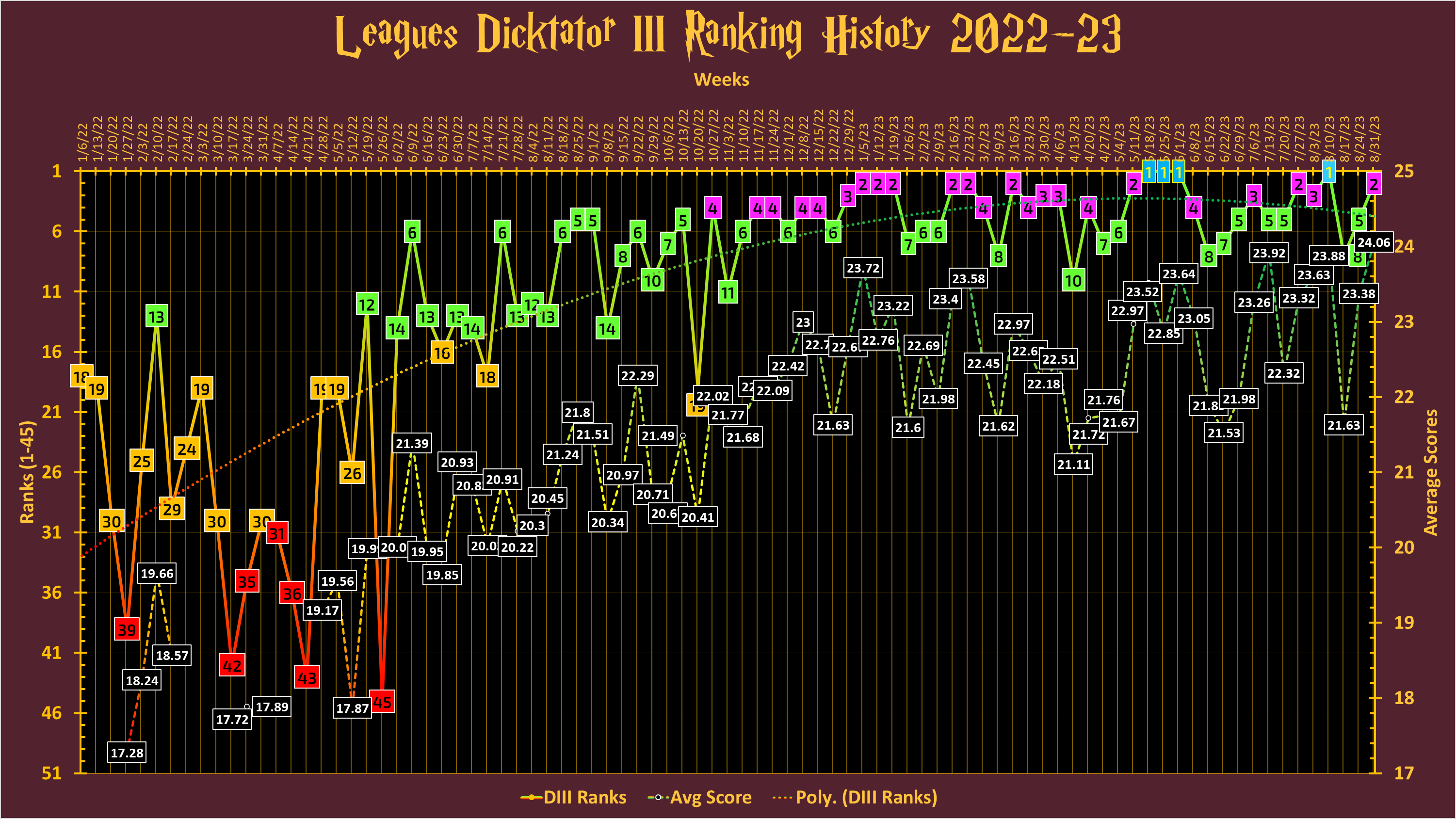 Rotation #0973 (9/3/2023 7:00 EST): Fuckland Gwenaelle 🔵 (November) Dakishi 🟠 (July) Snowboard Hari 🟢 (January)