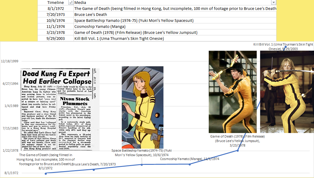 The anime "Space Battleship Yamato" (1974) and manga "Cosmoship Yamato) (1974) predate the release of Bruce Lee's "The Game of Death" which was finished 5 years after his death (1978). The anime was also before "Star Wars" (1977), "Gundam" (1979), and "Evangelion" (1994). People barely had color televisions in the 70s. 100 min of it was filmed in Hong Kong, back in '72, but people didn't see it until '78. Sometimes a yellow space jumpsuit is just a yellow space jumpsuit. The Bride's yellow outfit from "Kill Bill Vol. 1" however, was obviously a nod to Bruce Lee. I was just thirsting after her ass, but now I'm a little more knowledgeable about yellow jumpsuits, so thanks for that. -