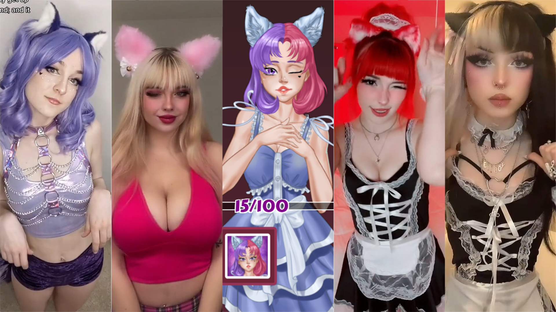 Wow! A dual hair colored purple/pink, cat girl, winking in a maid outfit, and doing a relaxed tempo side to side TikTok dance. I got 15 affection so far, w/ 15 league fights (3 drops, 20%), and 25 season fights (12 drops, 48%). I used a 25 kiss season reward. I like Alt. Blanche. She made me wanna browse TikTok for a bit. TikTokers (from left to right): jsucka, julia.burch, generic_elle, & lilly.mayble. -