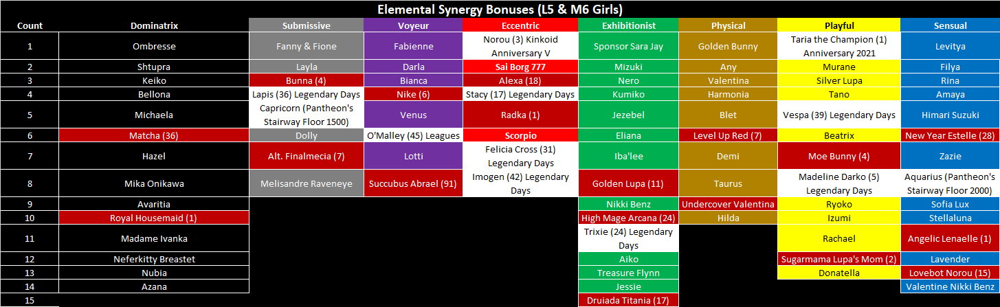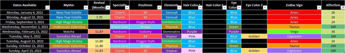 I was trying to figure out if I got all of the Mythic Pachinko L5s, if I ever saw Norou or Taria in them, and if MPx6s were worth anything to me, so I made this chart that shows the MP L5 history, their elements, and how old they are from their first Legendary Days events. I think I have all of the L5s in the current MP pool, so MPx6s aren't worth pursuing atm, since I have 10 of them. Update: Added previous 10 months of L5 MP rotations, including Norou & Taria.