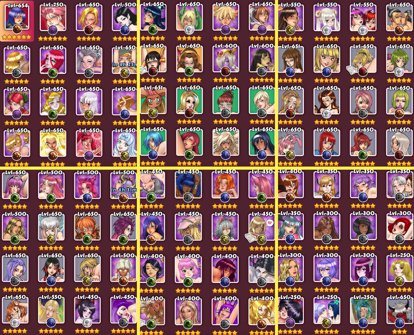 7520 vs 9400 at 750 A friendly correction. I'd personally like to chase after the Mythics now. I only have 2 of them, but still finished in 19th place twice in DIII the past 2 weeks. I've got 60 L5s, and ~20 of them are level 600 or higher. I have level 700 unlocked. I feel like I need the Mythics to keep progressing in Leagues and the Pantheon. I'm stuck at floor 1449 atm. Here's my "arsenal." I got Abraël to 6 stars and level 250 already. I only have ~620 girls, not 1000+, so I've maxed most of my girls w/ affection, and can just save it up until I need it. Still have ~250k affection leftover. As far as XP is concerned, I have 1.8 mil saved up, and even though I have level 700 unlocked, I have just enough voyeur gems for level 650, and she only needs ~675k XP for that. I'm waiting for CbC #10 to awaken her, but not sure if I'll do it all the way to 650, b/c I'd rather save the XP for day 4 of the LC. The dilemma is now, do I want to max her out immediately? No, since that'd be a waste of possible contest rewards. Then, which contest matters more? The CbC for an L3 I'm missing, or the LC for an L5, but I've usually obtained the L5 before day 4 anyway. Another possibility is to just slowly awaken Abraël, every CbC, and then dump XP into her on the LC. I don't mind spending the 5150 voyeur gems for level 650, b/c I don't really have lower rarity voyeur girls that I can max out for unlocking level 750. There's 2 CbCs remaining before the 22nd (LC day 4), so I might just get her to level 650 on this Tues. the 10th, CbC #10 day 2, for Huntress Venam, since I have Huntress Cunegonde already. My plan is to get 100 commons (besides the mythics) to level 700, to unlock 750. Cheapest route makes sense to me. I don't like the Mythic revivals. It's too difficult to get shards, and more costly, b/c you're forced to do 50 fights at a time. I think I'll skip Nike. I have a voyeur mythic now already anyway. I doubt I'll have enough kobans or SP boosters by the 23rd. I have 7k kobans and 1 SP booster atm. I'll wait to see the new Mythic on June 3rd, and if I prefer Radka, I'll wait and attempt to get her w/ much more kobans and 5 SP boosters. -