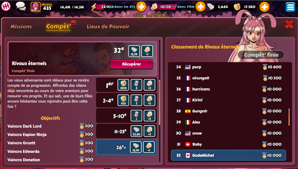 Bonjour. Dans un premier temps, je tiens à vous féliciter pour ce jeu. Je trouve ce dernier non dénué d'humour ce qui est un plus pour briser la monotonie des actions. Cela fait maintenant quelques jours que je joue et j'aimerais comprendre un élément du jeu. Donc j'ai bien compris que parmi les adversaires certains sont des bots afin de permettre la progression. Ma première question porte sur le set "super sexe" que je retrouve relativement souvent sur certains personnages du roster. J'en vois beaucoup avec un set complet avec des pièces du même niveau. Est-ce un "équipement de bot" ? Un équipement obtenu lors d'un event particulier ? Ou alors autre chose ? Et où peut-on l'obtenir (si c'est possible) ? Ma deuxième question porte sur un joueur en particulier que j'affronte actuellement pour le 1er rang de la compétition "Qui a dit corruption ?". DickyBoy semble un compétiteur aussi acharné que moi, cependant quelques détails me chiffonnent le concernant... Premièrement lorsque je fais une recherche sur son nom, je trouve un profil de joueur français de niveau 4 alors qu'il apparait comme joueur Serbe dans la compétition. La deuxième question est intimement liée à la 1ère : comment un joueur niveau 4 avec uniquement 4 personnages dans son harem peut-il tenir le rythme que je lui impose ? Son résultat actuel est 30940 points, soit 221 matchs gagnés. Cependant il ne peut pas être passé par les matchs, vu qu'il n'apparait pas dans l'autre compétition "Visa vacance-travail" où il aurait forcément obtenu des points. Donc ça voudrait dire qu'il aurait dépensé plus de 25.400.000, tout ça pour quand même perdre contre moi ou gagner bien peu de chose ; car il faut le reconnaître, ce qui se cache derrière les cadeaux du grand gagnant est plutôt maigre, pour ne pas dire décevant (jusqu'à présent - après 2 victoires - je n'ai eu que des items qui donnent de l'exp)... A moins, bien sûr, que ce personnage soit un vrai-faux concurrent, étant là pour stimuler la compétition et accessoirement amener d'éventuels joueurs à passer à la caisse. Voilà j'aimerais donc un éclaircissement sur ces quelques points du jeu. C'est un avis purement personnel mais votre concept est vraiment intéressant. Je pense qu'avec des graphismes plus soignés, l'ajout d'achievements comme sur beaucoup de jeux mais aussi, la possibilité d'avoir accès au profil des compétiteurs (en cliquant directement dessus) sans avoir à passer par une recherche dans la tour de la Gloire, vous pourriez attirer encore plus de joueurs et espérer gagner plus d'argent. Quoiqu'il en soit, je vous souhaite de réussir. Cordialement.