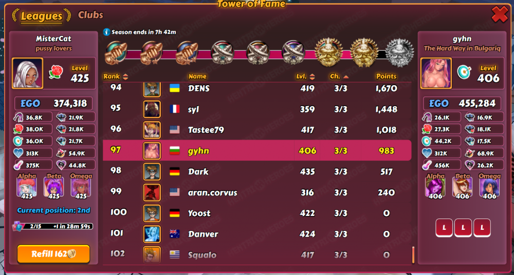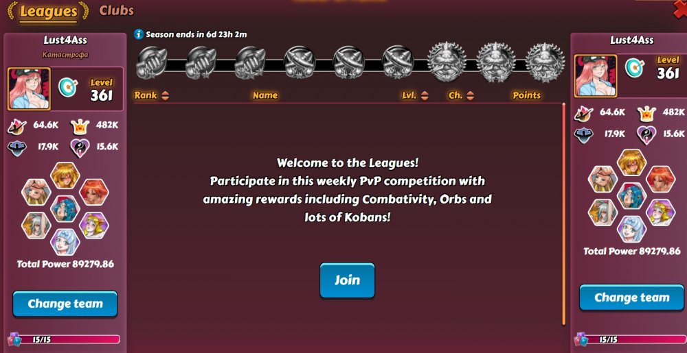 Hello, everyone! We would like to provide you with more information about the new big thing in the Haremverse, the Leagues. We are sure that it will bring you a lot of excitement and competitive spirit but before that let's make things more clear. Here you will find some of the most probably asked questions when it comes to a new feature: 1/ Where can I go to compete in the Leagues ? You can find anything related to the leagues inside the Tower of Fame, in the city screen. 2/ What is the goal of the Leagues? The Leagues were created to provide a new challenge for the competitive players in PVP. One in which they have the ability to select more strategically their opponent to optimize their ranking up. 3/ How do the Leagues work ? Your ranking within the leagues will be determined by the amount of points you can gather during the season. To win points, you need to challenge opponent, using challenge tokens. In case of victory, you will win 3 league points and only one in case of defeat. 4/ What rewards will the Leagues provide? Every combats will be rewarded with experience, depending on your opponent level. Also, at the end of the season, you will receive a nice reward depending on your result within it. 5/ How long will a season last ? A season will last for 2 weeks. 6/ How many players will be included in a league? Each league will be composed of groups with between 100 and 199 players. 7/ I can’t participate in the Leagues, why ? It is probably because you have not reached level 20, yet.. Whenever you will level up, you will be able to compete in the Leagues next season. 8/ I don’t want to participate in the Leagues, how can I do that ? The Leagues are totally optional as a feature. They are designed to increase the rewards in the game yet are not mandatory in order to upgrade your harem or to advance in the story. 9/ How many leagues are there in total ? There are 9 leagues in total. Yet, when launching the feature, 5 will be available. 10/ What will be the name of each league ? The names will be the following: Wanker I Wanker II Wanker III Sexpert I Sexpert II Sexpert III Dicktator I Dicktator II Dicktator III 11/ What is the best strategy to obtain a high rank in the Leagues ? The best thing to do is to fight with as many players as you can and try to focus first on players you are sure you will beat as you will be able to fight only with the members of your group during the season. 12/ How can I challenge an opponent ? In the Leagues tab of the tower of fame, you will be able to challenge opponents by selecting players from your group. A challenge will cost you a singular challenge token. 13/ How can I obtain these Tokens ? Every 60 minutes, you will receive one. You can stock them up to 5 in total. If you want to continue your ascension in your group without waiting, you can use kobans to recharge fully your point. The price rate is 0.36 kobans according to the time left. 14/ The current season is coming to an end, what will happen to my rank afterwards ? If you are among the top 15 players of your group, you will be placed in the superior league, but only if there are enough players to form at least one group. If you are in the bottom 15 players of your group, you will be demoted to the inferior league. If you have 0 league points, you will also be demoted 15/ A player has an equal number of points to mine, why am I below him in the ranking ? It is probably because the player has obtained his points before you. The system will register first the players that obtained this total of points at the earliest time and will prioritize the player that obtained them sooner. If this doesn’t resolve the tie issue, however, the system will look at each player’s levels and prioritize the lowest level between the two. 16/ If I stay in the same league, will I be in the same group ? If you begin a new season in the same league, the group you were in the previous season will be disbanded and new groups will be created randomly with all the players that are currently in the league. 17/ What rewards will be obtained at the end of the season ? Every reward is based on the difficulty of the league - the higher you go, the higher will be the reward. You can see these rewards by overing upon each league logo on top of the tower of fame. 18/ I saw that I could win combativity point in the higher league, but what would happen if I receive them while I’m already at 20 ? It will just go beyond 20, no point will be lost. 19/ I just received a message that told me that you couldn’t create a league for me. What’s happening ? It is probably because there are not enough players to form at least one group in the next league. For the time being, you will stay in the current league until there are more players promoted. 20/ When will the next season begin ? Immediately after the current one, the next one will be launched automatically. There is no rest for the wicked.