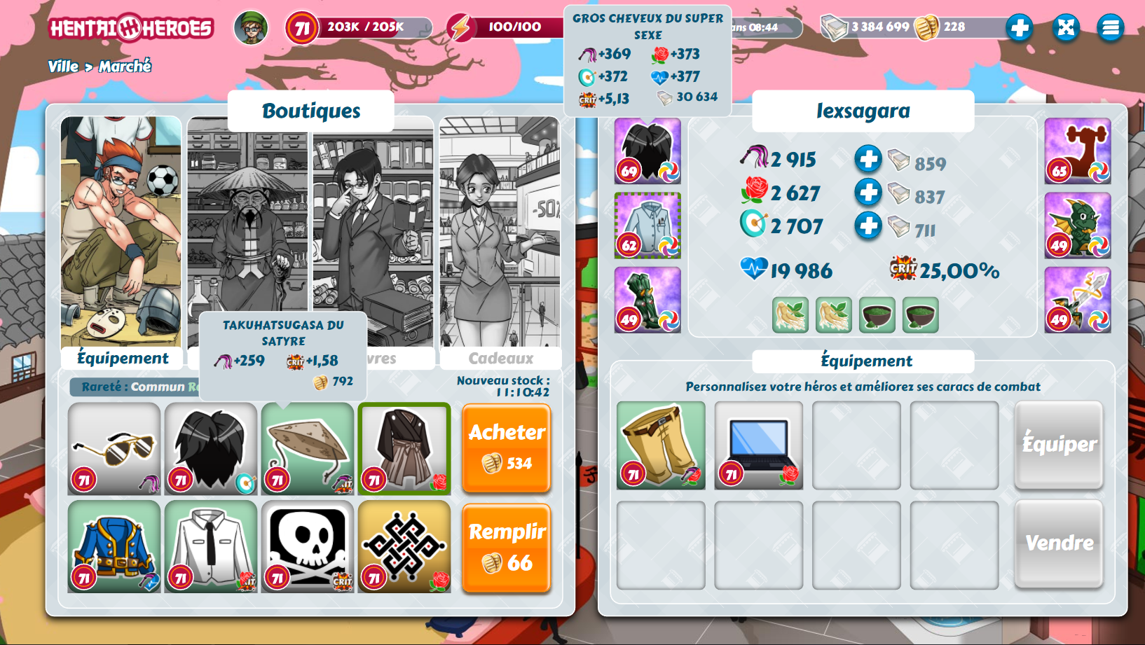 Bonjour, Je clique sur "Marché", puis dans la section "équipements". Et là les objets que l'on peut normalement tous acheter avec des sous, se retrouvent mixés entre achats sous et achats "kobans". Il n'y a d'ailleurs aucune logique, ex : Commun : Gros cheveux de charme coute 882 Kobans Légendaire : Pantalon de cuir du super sexe coute 492 Kobans C'est embêtant pcq je voulais justement prendre l'objet légendaire mais avec les sous classiques (pas les kobans), et là ça va disparaître dans 6/7heures, si le support pouvait au moins me le laisser en vente quand le souci sera réglé, ce serait super sympa merci J'ai tenté de rafraîchir la section ou le jeu plusieurs fois mais en vain. Merci de bien vouloir corriger ce bug svp. Bonne journée à tous P.S. : Je joue sur Ordi, sous windows 8, et sur Mozilla (au cas où ça aide).