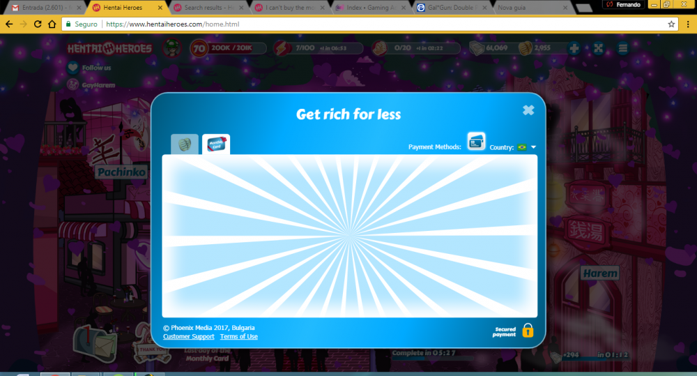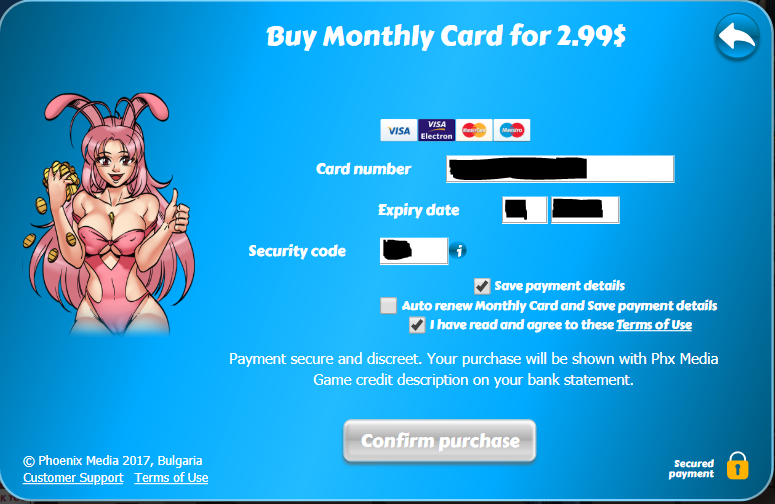 I have three cards and I get "an error processing the card" for all three cards. I've been trying to renew my monthly card for the past three days to no success. why wont you just take my money So apparently contributing on the Patreon page, alongside the other benefits, rewards me with "Equivalent amount of Kobans + a special bonus each month - HentaiHeroes.com or Nutaku". Wouldn't this mean contributing on Patreon is simply better than straight up buying Kobans? To be clear, I don't want to resort to something so underhanded just to pay for a game I enjoy. It's just that when I've been having troubles for the last three days with three cards (and quite frankly, this isn't the first time I've had card issues in the four months I've been playing), I just want something to work. Could I buy a monthly card access off of Patreon or something? I trust that Patreon/Paypal would work for something like this. Again, not trying to resort to something so underhanded, I just want to literally give you my money for your intended features. I have 60+ girls to collect from and the monthly card was pretty much my savior. On top of that, the method I use to collect, clicking one collect button and tabbing to the next, eventually tabs me to the Spend 12 Kobans to Collect All button, which basically makes me pay 12 kobans to collect almost nothing. If nothing else, at least let us toggle the 12 Koban warning message again...