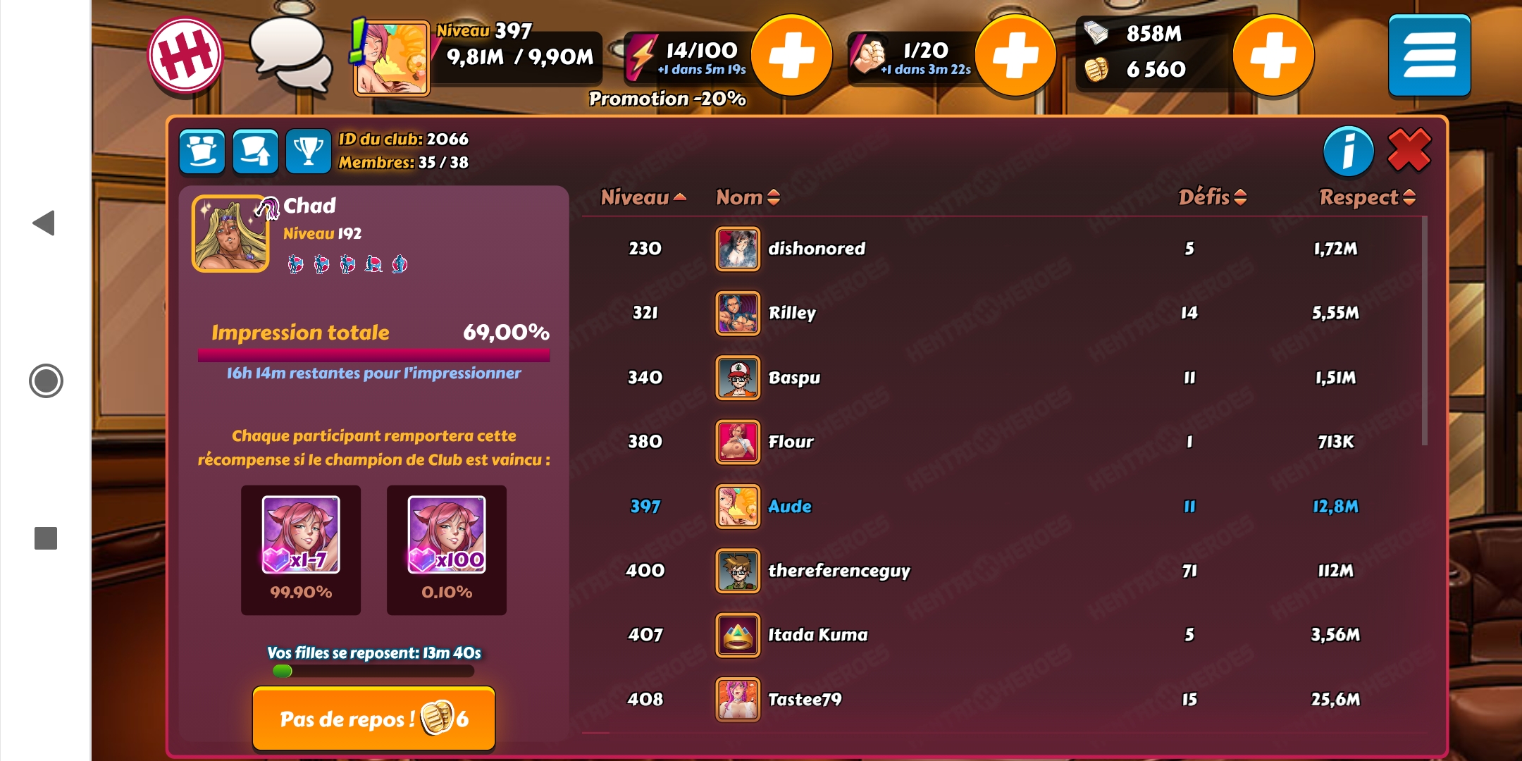 Paladin53 Posted February 14, 2021 Share Posted February 14, 2021 bonjour, je suis paladin53 , joueur de niveau 434 de spécialiste du savoir- faire avec 443 filles sur hentaiheroes je joue principalement sur mobile donc je ne peut pas utilise le chat mais j'essayerais de discuter un peu chaque semaine. j'attend votre réponse a ma requête d’intégrer votre club. Link to comment Share on other sites More sharing options...