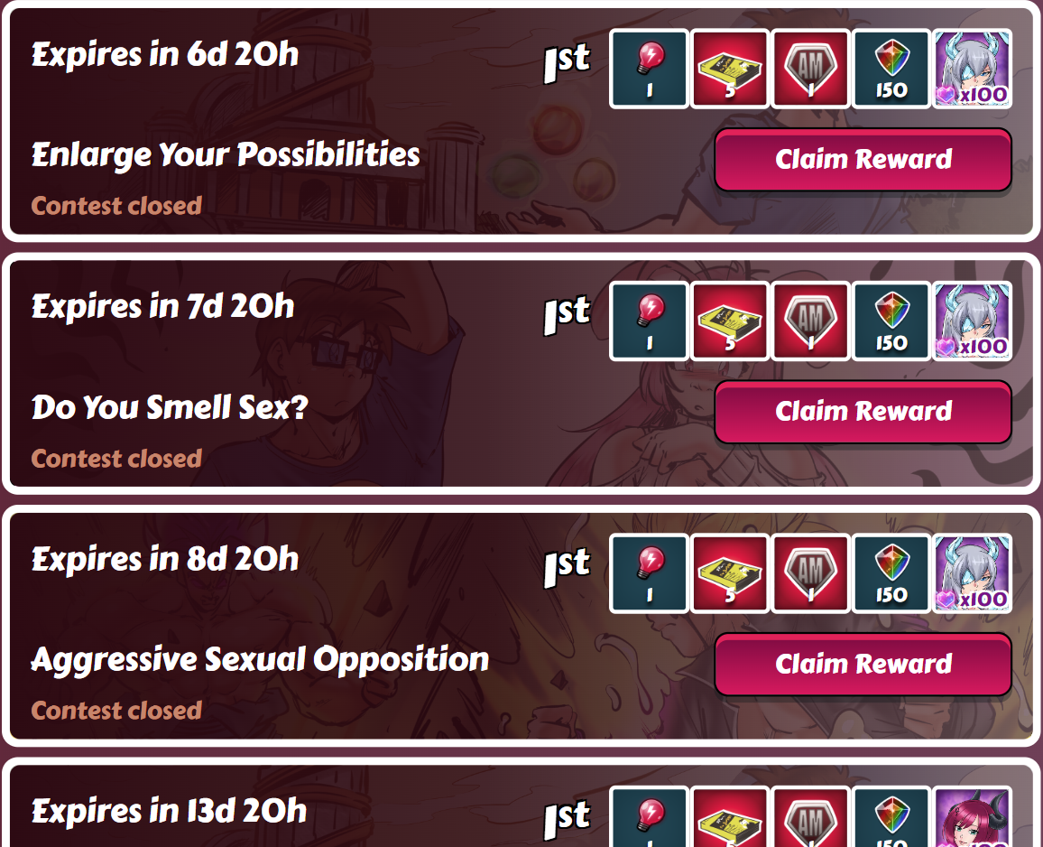 Moderator holymolly Posted December 19, 2023 Moderator Share Posted December 19, 2023 4 hours ago, Lapokabo said: Quick question about contests : how long do I have to claim a reward ? 24 hours or more ? until the end of the event ? I got the girl from CbC and was wondering if I could wait for a "Get Girl" contest in the days to come 21days.. pulls you might be able to use it for the last LC day 2 Link to comment Share on other sites More sharing options...