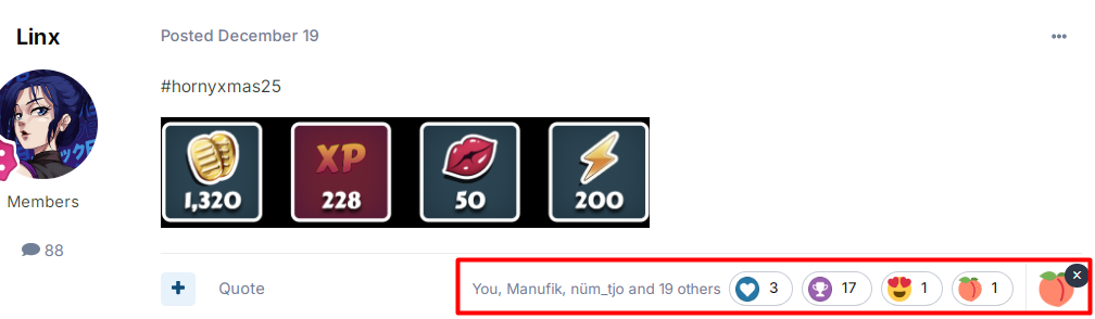 Tom208 Posted December 27, 2025 Share Posted December 27, 2025 (edited) Le 25/12/2025 à 13:46, Vovantillo a dit : Yes, I've noticed that giving gifts at Christmas isn't part of the KK pump tradition. They forget (or don't even know) that by giving, you receive a hundredfold. And that's true. Merry Christmas all! Not entirely true: a free reward of 1320 kobans doesn't happen every month Le 19/12/2025 à 22:47, Linx a dit : #hornyxmas25 Edited December 27, 2025 by Tom208 1 1 Link to comment Share on other sites More sharing options...