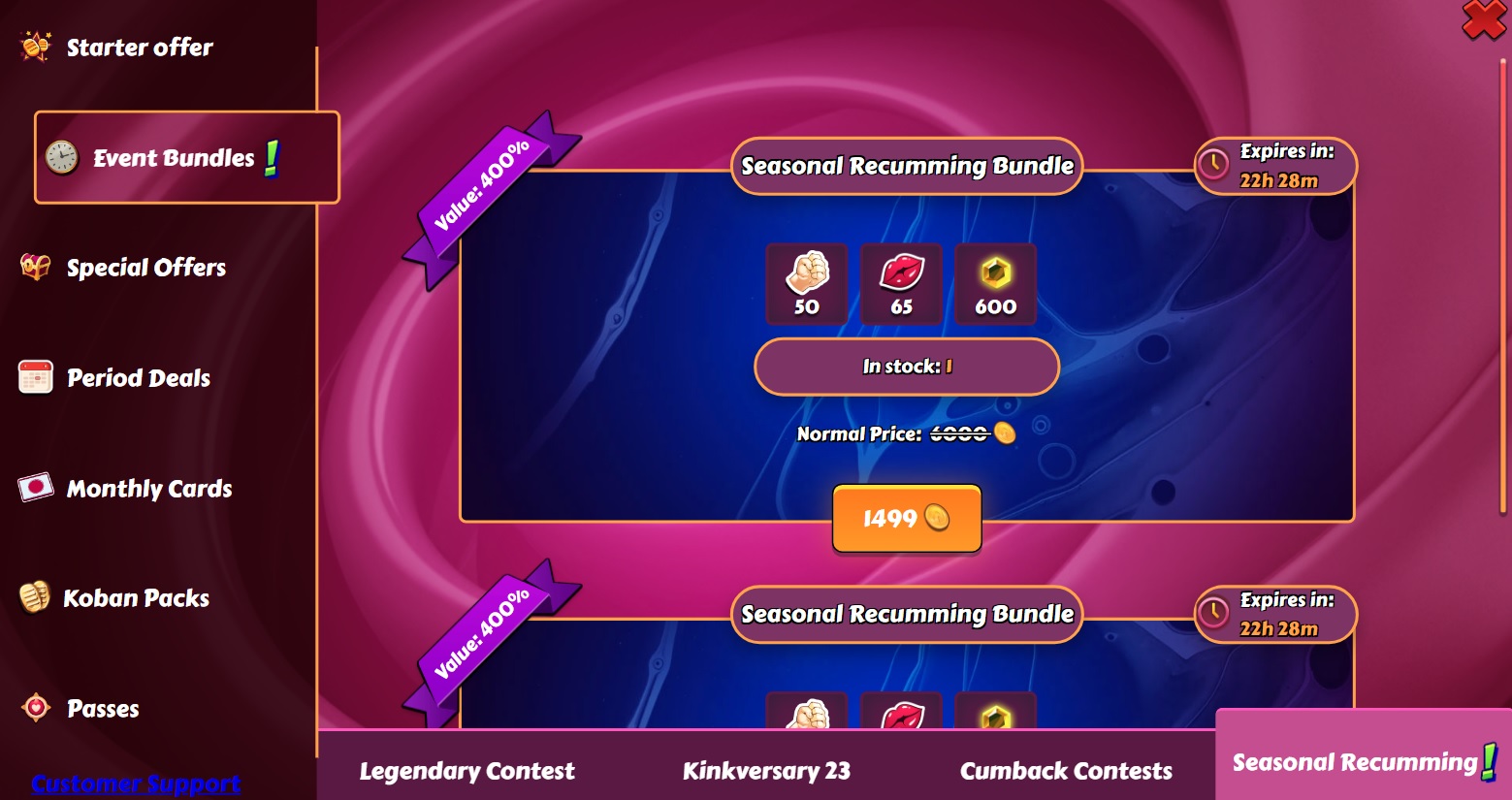 Horsting Posted July 19, 2023 Share Posted July 19, 2023 19 minutes ago, 430i said: It does, if you scroll to the bottom and stay for few seconds on the page Does not work here. It's on the seasonal recomming bundles: 2 are offered, I visited the tab, scrolled to the bottom (several times), waited for several seconds, even clicked on the buy button (not confirming 😉), and accessed them through the SER event page as well. It is still there. 2 Link to comment Share on other sites More sharing options...