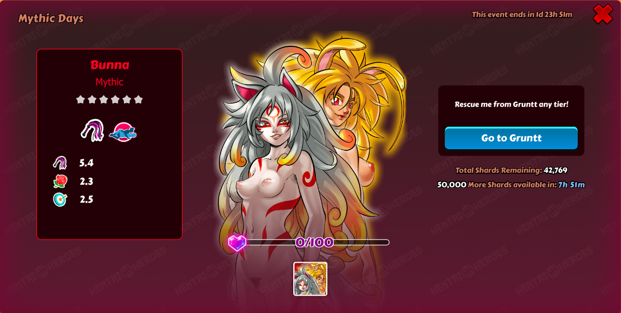Moderator FinderKeeper Posted December 7, 2020 Moderator Share Posted December 7, 2020 (edited) This is a new event type. Detailed event description is here. A Mythical Creature My fabulous hero, I want to give you a boner you’ll never forget and an unbelievable orgasm that only exists in myths. So let’s add more excitement to what we do and make the next few days MYTHIC! Get your fabled cock hard and ready because the Mythic Days start on the 7th and end on the 9th of December. You will be able to meet the most desirable girl no hero can resist. The myths say that Bunna is the horniest and most powerful creature and she can be tamed only by the hero who is strong enough to fight the monstrous Gruntt and give her multiple orgasms. Is that you, hero? Raise your dick if you know the answer! Boss Girl Bunna This event is unlisted in the calendar. It will happen at the beginning of each month during the Classic event. @Noacc Edited December 7, 2020 by FinderKeeper 6 Link to comment Share on other sites More sharing options...