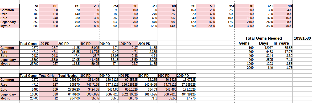Amartie Posted November 14, 2021 Share Posted November 14, 2021 It's going to be a factor of how common gems will be, I am betting we will see a focus on Playful and Eccentric Girls should there not be a hard daily gem cap, seen as they are only the ones from a common action. I made a table looking over times for upgrading girls from a new account. Estimating days per girl at set gem rates per day. Total girls are calculated at a factor of eight, as if the game is balanced the player should be able to achieve an overall balance of all eight gem types equally per day. PD = Per Day. I doubt we will see anywhere near the estimates of the table in gem drops. 7 Link to comment Share on other sites More sharing options...