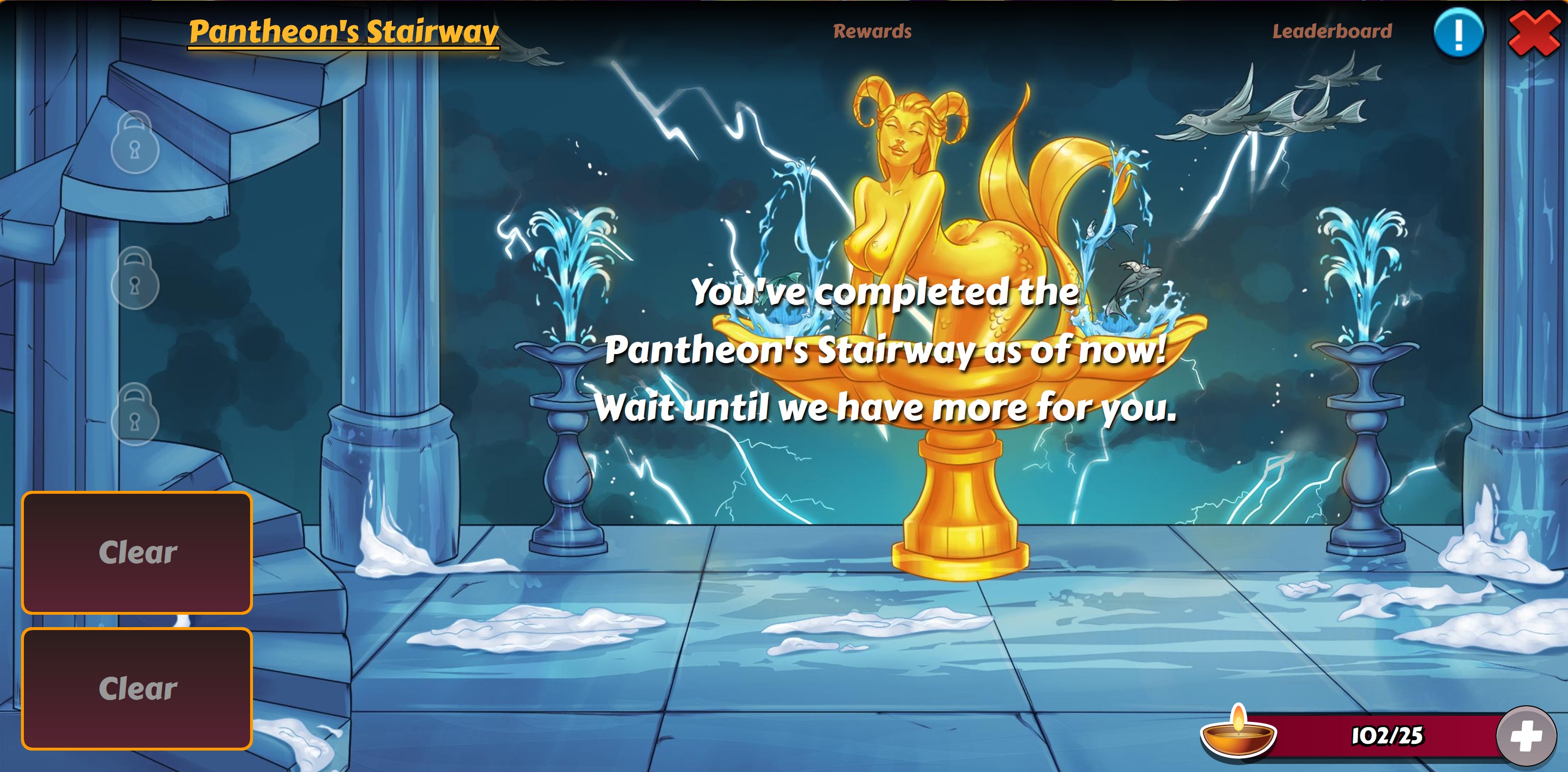 Moderator DvDivXXX Posted July 6, 2023 Moderator Share Posted July 6, 2023 7 hours ago, Ravi-Sama said: 8 hours ago, OmerB said: And a question [about] previous posts - Is there a reason to beat temple 2001? I thought there's nothing after it, so you get stuck. There isn't really a good reason to beat the 2,001st wall, But there IS a very good reason to avoid beating it at all costs: not cutting yourself off from all future "do pantheon performance" tasks. They added temple 2001 specially to let us keep doing these after we complete the feature. 7 hours ago, Ravi-Sama said: Also, even if you did, and if there's nothing past 2,001, it's not like the pantheon is really necessary for completing daily goals. Necessary to reach 100 points, almost never (although it is random and you never know; I had days where half of my daily goals were the same task, including this one). However, it's useful, reliable, easy and free and it's also definitely needed to go a bit beyond the bare minimum of 100 points, which is good for PoG and sometimes for other things too. I highly recommend not cockblocking yourself out of this feature presumably forever just to see if you can join the couple of players who already made this mistake. 4 Link to comment Share on other sites More sharing options...