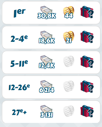 Vercingémanix Posted November 8, 2017 Author Share Posted November 8, 2017 Concernant les récompenses de compétitions : elles redeviennent graduelles, en fonction du niveau du joueur. En clair, + le niveau est élevé, + les récompenses le sont aussi. Les gains vont donc augmenter graduellement jusqu'au niveau 400. Link to comment Share on other sites More sharing options...