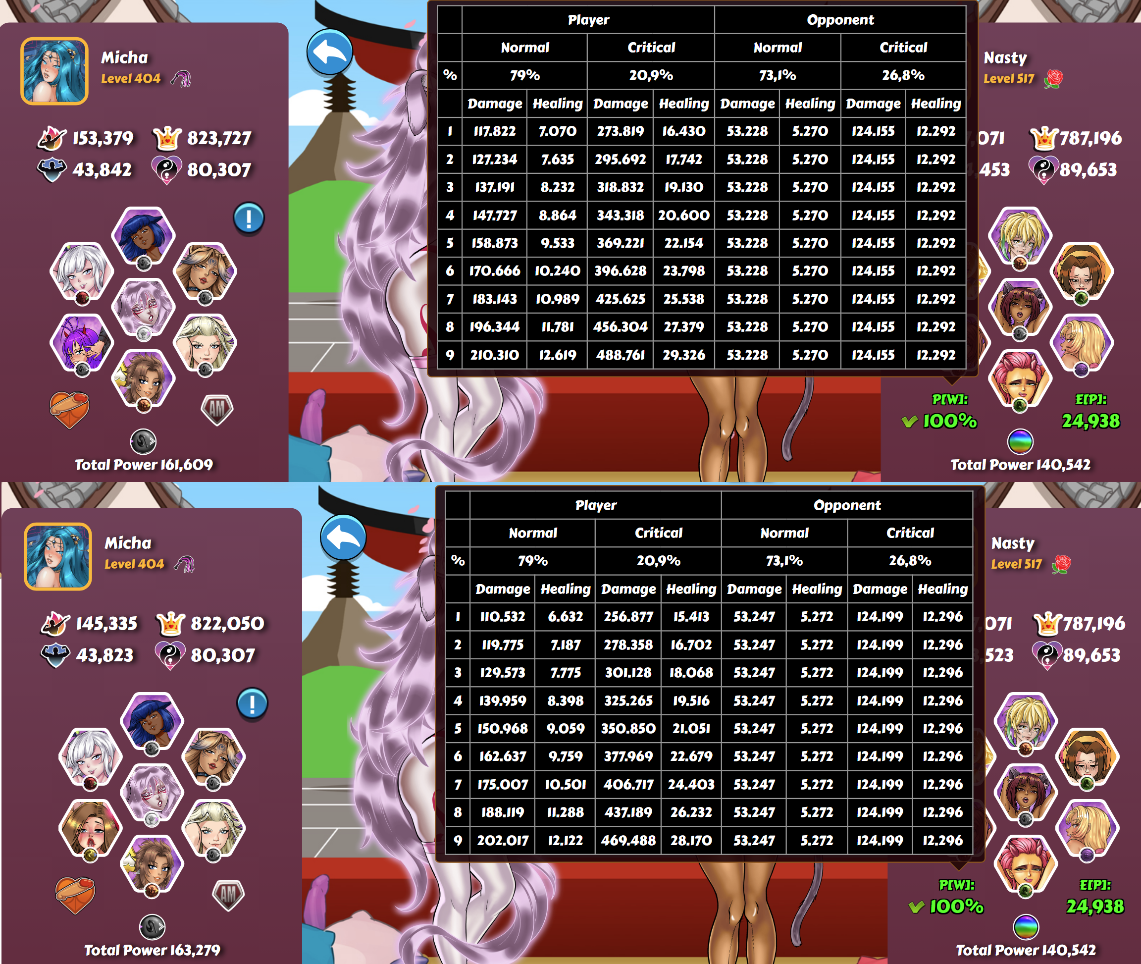 Moderator Ravi-Sama Posted November 8, 2023 Moderator Share Posted November 8, 2023 @renalove & @430i I recently updated to your new scripts. 😊 Thanks! I like that the girls' attributes are visible now w/ little icons at the bottom, while hovering over them. Useful to check if a player is actually making proper use of girl skills. Also, to double check the synergy of your own teams. Wish it was like this throughout the whole game. The booster sim on the league table is impressive. I see it shows that 4 chlorella + LM is best for un-boosted players, and 1 chlorella, 3 cords, + LM are best vs. the boosted ones. It helps me prioritize which players to attack first, w/ which boosters, before they're about to expire. The skill sim makes me think that level 5 stun is the 2nd best, behind level 5 shield. ---------------- I also like the new column w/ bulbs, which is highlighted red if they're using a tier 5 skill. It'll help me focus on those players first. Mine shows 141, b/c I'm using 22 bulbs on 5 L5s (110), and 31 on my shielded M6. Good to know that the browser's local storage can fill up, and it should be deleted after each league week. I don't actually make meaningful use of those .csv files. Before these scripts, I used to manually take snapshots, and graph out the players' scores over time for the LAA thread, but it was tedious, so I stopped doing it. I do like the idea of seeing potential lost points. I've been keeping track of that just for my own score, but being able to see it for the players that might be threat, is useful. It isn't working properly for me atm, b/c I updated it in the middle of the league week, after clearing previous snapshots out of caution. Would definitely relieve some stress, to know a player you were competing w/ was way behind, w/ too many lost points to be a real threat. 3 Link to comment Share on other sites More sharing options...