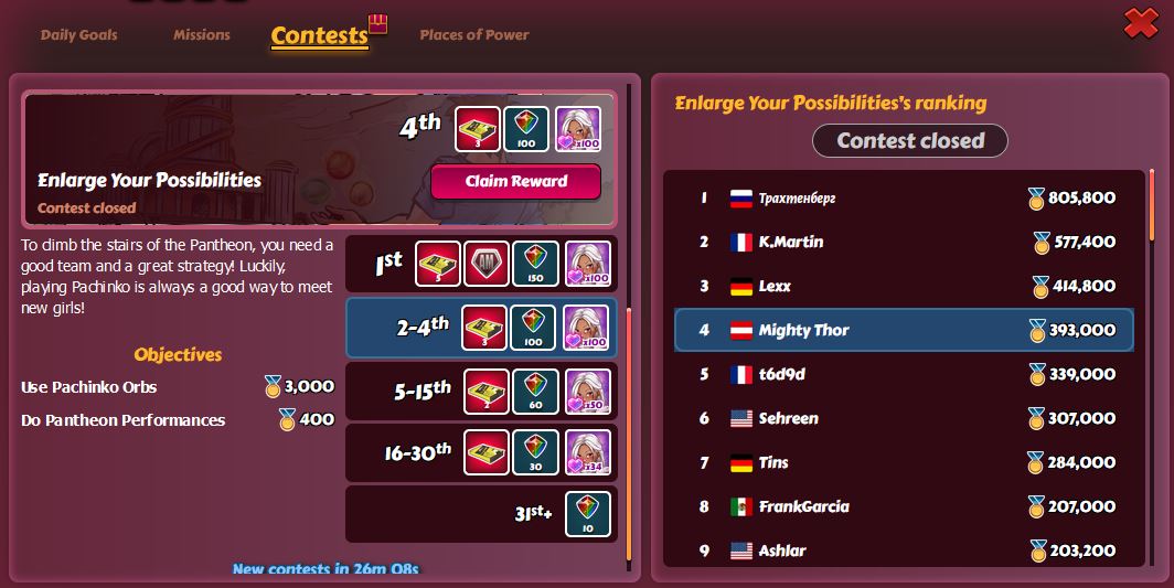 Mighty Thor Posted August 10, 2022 Share Posted August 10, 2022 (edited) CbC 23 - (Pearl) - Day 2: Yeah, this time I could even reach 1st rank with 550,470 points (14,900 gems). 1st - 550,470 4th - 249,510 15th - 56,490 30th - 13,710 In the daily contest I missed Top4 and could reach only rank 5 (1,578,900 points), though I did a lot of uplevellings. But I also didn't want to claim player-XP rewards from seasons, PoV or PoG now. Edited August 12, 2022 by Mighty Thor 4 Link to comment Share on other sites More sharing options...