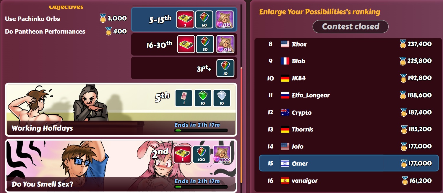 Liliat Posted October 25, 2022 Author Share Posted October 25, 2022 1st: 600k 4th: 431k 15th: 114k 30th: 37k I managed to hold 3rd place at 433k despite 5 last-minutes snipers (Including myself 😛 ). Pretty expensive, and I didn't get a girl from MP with all these orbs, but it's fine - I need the rewards. 8 Link to comment Share on other sites More sharing options...