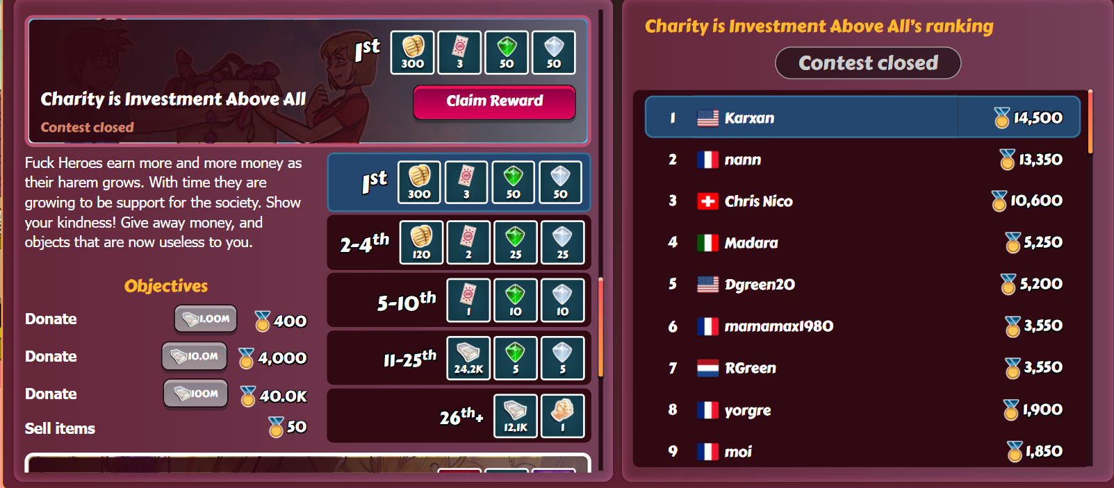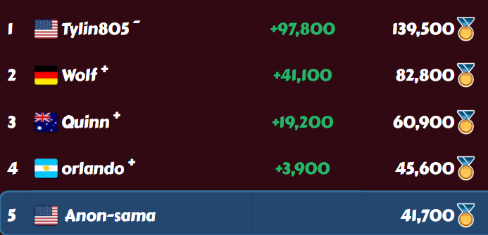 Moderator DvDivXXX Posted June 15, 2023 Moderator Share Posted June 15, 2023 Mostly batches of x10s on the CC. I've been playing plenty of villain fights too but that's a small percentage (the points per koban ratio for this particular contest is much higher for CC fights than villain fights). To be clear, this was way overkill. I was sitting pretty at #1 my somewhat usual ~70-80k but then the crazy player started to contest me and eventually I was like 40k behind him in the last two minutes so I just made constant x10s on the CC until reset. ^^ Nowhere near worth what I got out of it, except for the satisfaction of making my challenger regret pushing me that far (hopefully). Link to comment Share on other sites More sharing options...