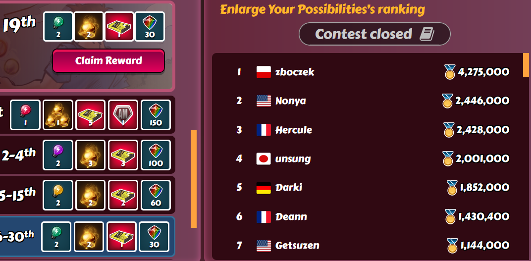 xRob91 Posted June 12, 2025 Share Posted June 12, 2025 I knew from the beginning that 1st will be out of reach. Burzumas whaled 160k points just a few moments after contest started. I refilled some CP to complete PoR and it was enough for a safe top 4. 2 Link to comment Share on other sites More sharing options...