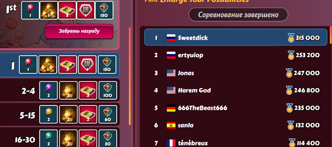 Vovantillo Posted July 1, 2025 Share Posted July 1, 2025 Easy first. We didn't have many people willing. With a minute left, I had 255,000 points. I threw in another 20 spheres, just received in the Pantheon, with the thought that someone else would decide to rise higher. But no one below me moved. The 15th had - 58,000, the 30th had - 15,000. 1 Link to comment Share on other sites More sharing options...
