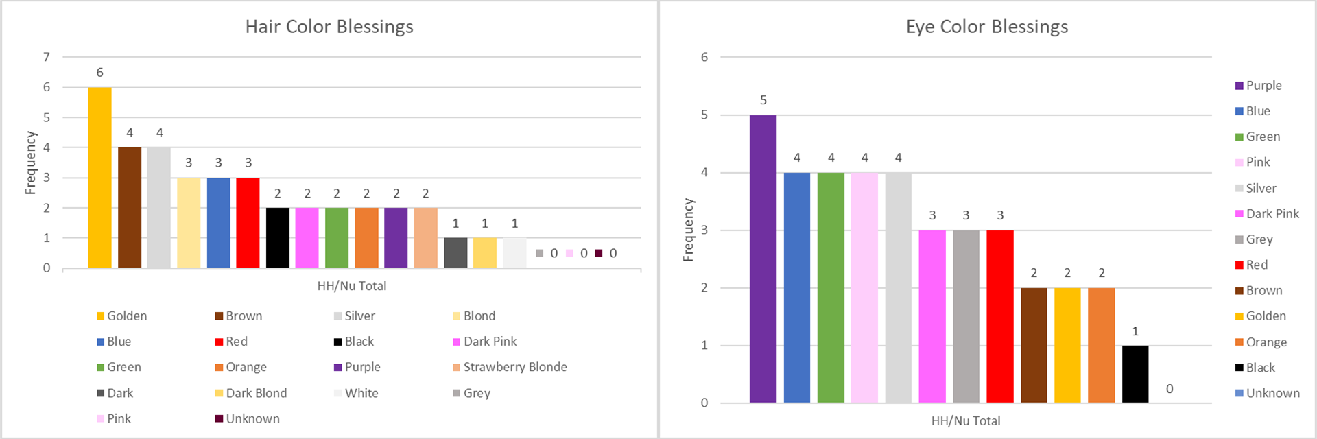 Moderator Ravi-Sama Posted August 2, 2022 Author Moderator Share Posted August 2, 2022 7 hours ago, Rarum said: In data visualization it's even best practice to avoid pie charts (humans being better at gauging lengths than areas or something). But it gets "sin-worthy" when you add a 3D component. I mostly looked at the raw numbers in these graphics personally, which to me signifies a failure for the visualization. Okay, in an effort not to sin w/ pie charts, here's some bar charts. The pie charts were requested, and I think they're fun & look cool. I also paid attention to the numbers, even w/o the charts, so my interpretation didn't change. I still think hair and rarity seem suspicious. The rest could be random. 3 hours ago, EpicBacon said: There is nothing stopping you to make your own analysis about the data using whatever type of graph you want. And I don't mean this in any condescending way, I just happen to like pie graphs, I don't do detailed analysis of data, I don't know what is the most "efficient" or what is the best representable way to display data. I can do it quick. I have the tables already. 1 hour ago, DvDivXXX said: ...You're right that this kind of thing should be avoided, especially sources using them deliberately for their agenda. I think we'd all agree it's not what Ravi did here, even if the pie chart format does twist our perception by itself (for instance the two 7 slices up front in the Rarity pie look HUGE compared to the ones shrunk down by perspective, even the 11 one). Yep, not trying to distort the data. I don't have an agenda,... except maybe to vent about Bunna's grey/pink hair never blessed. It still could be random I suppose, b/c 220 blessings isn't a huge sample size, even though it took a year. I'll *put on my tinfoil hat* anyway, b/c it's both of Bunna's hair colors, and they weren't blessed on either HH or Nu. Also, they removed Royal Housemaid's pink hair, and replaced it w/ unknown for no reason, so I know they like to meddle w/ this kind of thing, ...hair color rant over. 4 5 Link to comment Share on other sites More sharing options...