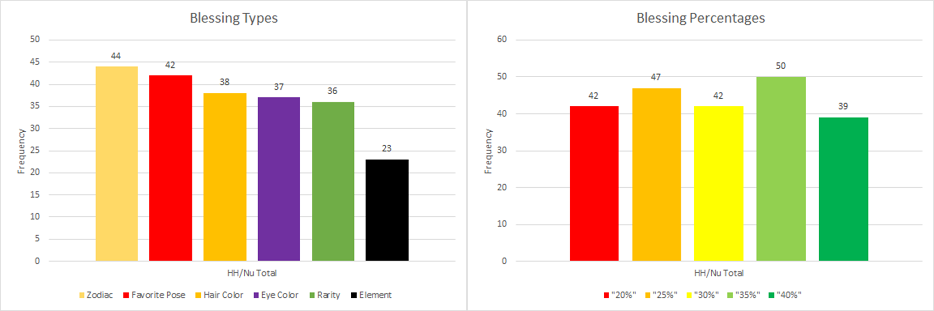 Moderator Ravi-Sama Posted August 1, 2022 Moderator Share Posted August 1, 2022 (edited) We've had a little over a year of blessings now, on both HH and Nu. 1 year & 3 weeks, or 55 weeks. It makes sense to analyze it, to see if there's any irregularities, or trends. Are they truly random? All of the pie charts are HH and Nu's blessings combined, to help see the bigger picture. 55 weeks * 4 blessings = 220 blessings total. There's some outliers unique to HH and Nu, that I'll point out. I'll spare you from having to see all of the regular charts, there's 9 of them. Forgive my liberal use of color @DvDivXXX 🙏🏽. I think it's justified, and helps in this context, for rarities, elements, hair, and eye colors. Out of the 6 attributes that can be blessed, Elements have been blessed least often (14 HH, 9 Nu, 23 total), ~60% below the 36.7 avg (220 blessings / 6 attributes), and Poses/Zodiac are most often blessed (42-44 times) 12.6-16.5% above avg. Edit: elements didn't exist for the first 15 weeks of blessings, so it's close to it's own 26.7 avg (160/6). Specific elements are blessed least often compared to the rest of the attributes. Only 23 times, compared to the avg of 36.7. Edit: Since elements didn't exist for the first 15 weeks, that's closer to the avg of 26.7. (55 weeks - 15 weeks = 40 weeks * 4 blessings = 160 blessings / 6 attributes) Dominatrix, Exhibitionist, and Physical were blessed most often (4 times each). Perhaps uncoincidentally, the sensual element has never been blessed on either HH or Nu. Eccentric was also never blessed on Nu. It should've happened at least 3 times on average. It's not as if sensual girls haven't been blessed at all, but whenever they were blessed, it was due to some other attribute, besides the sensual element. The range of percentages that each attribute is blessed, is pretty even, and unbiased. A 35% blessing is most common (50 times). I expected to see that a 40% blessing occurred less often, and it did (39 times), but it's still close enough to the avg of 44 (220 blessings / 5 percentages), that it could be random. Nothing fishy to see here. Nose dive, doggy style, and splitting bamboo are the most often blessed positions (5x M6s). Dolphin and Suspended congress were never blessed on HH (3x M6s). It seems like Charm had a slight advantage here. There's 12 of them, so the avg should be ~3 (36.7/12). Nose dive is double the avg, but I think it could still be random. There's only 1 nose dive M6, Druiada Titania. Gemini, Sagittarius, and Virgo were blessed the most often (4x M6s, there's no Sagittarius M6). Libra and Leo were never blessed on HH (3x M6s). Capricorn and Pisces were never blessed on Nu (3x M6s). The most common mythic zodiac sign is Aries, w/ 5x M6s, and they were blessed 3 times, which is avg. Once on HH, and twice on Nu. There's 12 zodiac signs, so the avg should be ~3 (36.7/12). I feel like an Astrologist. Golden, Brown, and Silver hair were blessed the most (4-6 times). Grey, Pink, and Unknown hair were never blessed. There's 17 hair colors, ignoring unknown, so each should've been blessed at least twice on avg (36.7/17). *Looks at Bunna, Golden Lupa, and Royal Housemaid* Purple eyes were blessed the most (5 times), which favored Matcha. Blue, green, pink, and silver eyes, were also blessed often (4 times), which benefits 13x other mythic girls. Black eyes were blessed the least (once), only really affecting Stellaluna. Orange eyes were never blessed on HH, excluding the L5s Ryoko and Vespa. Golden and Black eyes were never blessed on Nutaku, which excludes the 3x M6s Bunna, Golden Lupa, Succubus Abraël, and another 6x L5s. There's 12 eye colors, excluding unknown, so the avg should be ~3 (36.7/12), and it seems very close to that. Rare girls were blessed about twice as often (6 HH, 5 Nu, 11 total) as legendary girls (3 HH, 2 Nu, 5 total). That makes me feel better about maxing my R5s. Whenever all legendary girls are blessed, we tend to make a lot of progress in the Pantheon. In a year, it only happened thrice on HH, and twice on Nutaku, when it should've been 3.67 times on avg for both (36.7/5/2). I'd say Nutaku is overdue for another legendary blessed week. (I play on HH, so that's an unbiased statement). My conclusion is that the frequency of blessing percentages, eye colors, zodiac signs, positions and elements seem random, and unmanipulated. The sensual element was never blessed, neither on HH, nor Nu. Eccentric was also never blessed on Nutaku. At first I thought this wasn't random, but now I understand that elements had 15 weeks less time, so it does appear random. However, the blessing frequency of the hair colors, and rarities show signs of manipulation, and might not be completely random. The hair colors grey and pink, which would benefit Bunna & Golden Lupa, were never blessed, neither on HH, nor Nu. Bunna's first MDR occurred during the first blessing week (July 23rd, 2021). Perhaps, that would've made Bunna super broken. I finally recently acquired Bunna, like 11 others on the forum, so it'd be a shame if there was some "soft-ban" curse upon her dual grey and pink hair colors, and if that's just an illusory advantage, w/o a real possibility. There's 17 hair colors, ignoring unknown, so each should've been blessed at least twice on avg (36.7/17). Is it a coincidence that Bunna's hair colors went unblessed for a year? *shrugs* This also leads me to believe that dual eye colors are better than dual hair colors, b/c they're blessed about once more on avg per year, (Eyes @ 3.67 vs Hair @ 2.15 avg frequency). I have 60 girls w/ dual hair, but just 29 w/ dual eye colors, making them rarer, so this would make sense. There's also only 1x M6 girl w/ dual eye colors atm, Succubus Abraël. Rare girls were blessed (11) twice as often as legendary (5) girls, 49.8% above the 7.34 avg, and that speaks for itself. Thanks to @zoopokemon for recording the weekly blessings. I only play on HH. Otherwise, I wouldn't know Nutaku's blessin