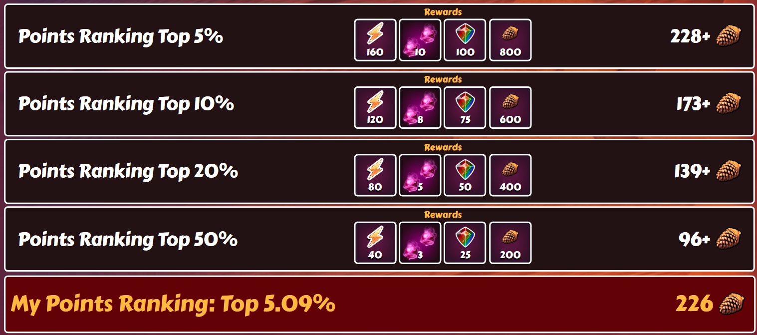 OmerB Posted November 5, 2023 Share Posted November 5, 2023 12 hours ago, bolitho76 said: Until 24,.000 points you gain 39 times "random 10 shards" - To gain all 4 new event girls you need 40 times and the random shards are restricted to the new girls, so... Also to mention: with Event Cards you can gain another 180 Sapphire. A little calculation how much points a f2p player can expect: natural regen: from Leagues: 4x297 + 2x41 = 1270 points from Villains: 54x30 = 1620 from Daily Goals Chests: 25x30 = 750 from Pantheon: 30x30 = 900 from Champions: extremly different from player to player - in case of this calculation I expect that it's possible to fight 8 times a day against a Champ so: 8x7 x30 = 1680 points So from natural regen are 6220 points expectable. Leaderboad: An active player should be able to stay at least in the top10% (while LR we had ca. 38.000 active players at hh and ca. 15.000 active players at nutaku - thanks to zoopokemon who had tracked theese numbers). Another 5400 -7200 points here Cards: Free card: 450 points Medium card: 1320 points and 60 sapphire Big card: 2640 points and 120 sapphire So from cards a total of 4410 points Events: PoV (with Bonus Path): 38 comabtivity x2 = 96 points Season: 86 points - what? Ahh, you mean the fists from there probably. More points from other events are possible. An active f2p player (who isn't a newby) can expect: 6220+7200+4410+180 = ca 18000 points I'm not liking this at all (In fact, it's the worst of the Mega-events so far imo). My short calculation: With 54 villain fights, 42 league fights, 10 pantheon fights, 30 tickets and 25 points from the chests per day - you get 181 points a day. I took 188 points per day, with the free card - In 30 days that would be 5640. If you're taking both medium and big card, and will be using all of the fists - that's 3,960 points. That gets us to 9.6K points (with all the cards). Now with the 3-days ranking - If you're on the top 10%, that's 5400 points in total. If you're on the top 5%, that's 7,200 points in total. So it's very possible to get to 15K. But reaching 15K will give us: 30 drops of 10 shards each 250-260 blue crystals - which can give us 60 extra shards of the new girls. The problem is that the shard drops are random, so we will probably won't get 3 girls by getting to 15K, but only 2 girls. so overall, more work and resources are needed to get 2 girls, compared to the first seasonal event. The "regular" Seasonal event, as much as we didn't like it, was the best format. Link to comment Share on other sites More sharing options...