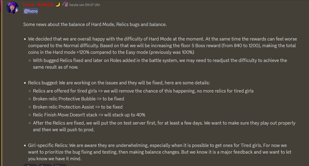 Moderator DvDivXXX Posted February 21, 2024 Moderator Share Posted February 21, 2024 On 2/20/2024 at 11:02 PM, bohammettuz said: My assumption was that I actually knocked out the front girls in the previous fight, and that mid and back girls move up towards the front to fill empty spaces. 5 hours ago, Horsting said: This is definitely the case. I never watched a backline girl being brought down to 0 ego in any of my runs, neither mine, nor opponent ones. In the easier fights, GS5 skills are rarely used, in the harder fights, the skill damage at this stage of the battle is not sufficient enough to bring them down before front and mid line fall. Thank you both for confirmation on this. So the back line is indeed the safest one, contrary to what I thought due to GS5 and special skills? Good to know, and my bad then. I hadn't even considered that the game would move the remaining girls one line ahead in between the failed fight and the rematch, honestly. Seems both more complicated and less intuitive than just leaving empty slots where there was an opponent you actually defeated in the first match. --- 2 hours ago, bolitho76 said: Sadly the +50% coins from the normal stage is exactly the amount of coins you get from the 4th floor. (280+560+840)/2=840 2 hours ago, mdnoria said: So Hard is +100% coins than easy. Well, strictly in terms of coins, double the rewards is already a lot (plus you also get more Fists, Kisses and PXP). It means if I'm able to complete a full run on Hard consistently every other day, I get as many coins as when we had the Easy mode daily (and likely more PXP, Fists and Kisses overall, since Floors 1 & 2 aren't as rewarding as Floor 3 and now 4 & 5 which seem to be at least on par with Floor 3). That's nothing to sneeze at (provided I can complete it reliably). --- @Stoned Jesus You seem to have been a bit on tilt or maybe even just in a "why even bother" mode judging by your posts today. I haven't read the other threads yet, but I'll likely answer you in the one in OT. Hope you don't stress too much over this game, this forum or anything else HH related in any case. Hugs! Link to comment Share on other sites More sharing options...