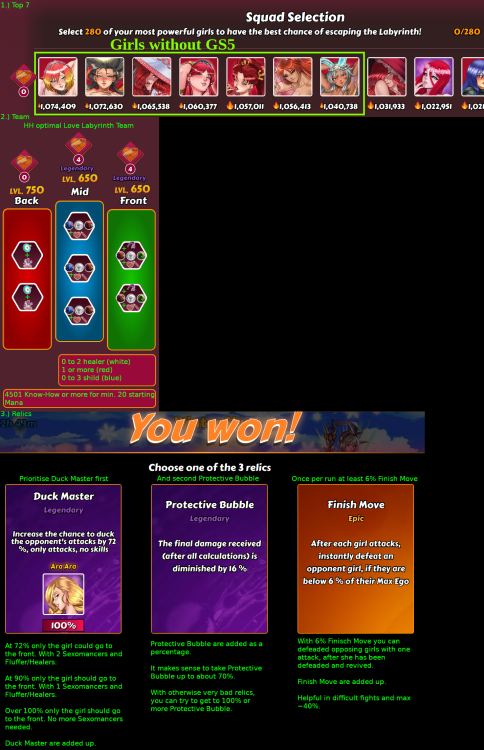 Ich42 Posted January 15, 2025 Share Posted January 15, 2025 (edited) Soon I will have two blue Know-How Sexomancer. So I've basically one color which does damage in my team. Let's see if I notice a difference. @bolitho76 I have also made small changes to the texts. Proposal for the uT&T: a) A summary as introduction: Here is a short summary that explains the most important things. For more detailed information, please read the appropriate section. Top 7: ... Team: ... Relics: ... Everything in one picture: e) After a Battle ... Draw: After 100 rounds (with or without "Skip" and usually 1400 individual battles) when there is no winner. A draw is automatically displayed. The last state of the damage and disabled girl is taken for the next fight, with the starting mana. f) Skills in the Labyrinth for bolitho76: can you Move this red skill on the Top of the list? 🔴 Eccentric (red) 5% - 6.25% - 7.50% - 8.75% - 10% Casts a damage over time effect on two random opponent girls that ignores defence (can be blocked by shields). Strong against high defence girls, lasts three rounds. Does not trigger Finish Move (Relic) by itself, but can reduce girls ego down below 0. In this case there is a numbers bug, see more under bug list. Red skill stacks in duration, not damage, if hit by several Red skills, they will take effect in order casted.small changes A girl hit with 2 Red skills of 10% damage each will have 6 turns of 10% damage, instead of 3 turns of 20% damage. However, the symbol is no longer visible after the first 3 laps. But the damage is still calculated. And only becomes visible again when the girl is hit again. The whole thing is displayed with a round symbol with a flame in it at the top right to the girl's avatar: h) The Relics for bolitho76: can you Move this 3 relics on the Top of the list? Duck Master Gives % chance to dodge oppononent normal attack. Will dodge all normal attacks if value exceeds 100% Stacks additively. Protective Bubble Reduces damage by %, each additional relic have reduced effective protection Stacks Consecutively, highest rarity first. Finish Move After each attack, defeat and opponent girl, if they are below % max ego Reported by devs to stack up to 40%, highest value i've reached is 38% and confirmed working up to 37.45% ego. Currently does not work with "Defeat Medication" Stacks additively Will also trigger this relic with 0 damage if the ego falls below the limit due to a skill. ... j) The FaQ: ... Q: Am I strong enough for the hard run? A: In the Hard run, the fights are more difficult than in Normal run and the Boss 5 fight are very difficult. However, there are some strategies that have proven to work well. The best strategy that has proved here is survival. Your team must be able to survive as long as possible, or even better, every cycle without damage. So that your team can spread damage over a very long time, even over a draw. You need the right relics for this, otherwise you have a little chance without rejuvenation Stones. With the wrong relics, even very good teams can be defeated as early as the Boss 3 fight. For relics prioritise Duck Master first (Max > 100%) and second Protective Bubble (are added as a percentage) both add up. These can be combined, as long as the relics are available in the selection. You should also have at least 6% Finish Move so that opposing girls can be defeated again with one attack despite opposing Sexomancer and Fluffer. For Duck Master the following would make sense: > 50% dodge, the girl could move to the front to make room for another girl, e.g. an Damage over time (red). > 70% dodge, only the girl could go to the front. Since most attacks are dodged here. Its recommend to have at least 2 Sexomancers with Fluffer/Healers here. > 90% dodge, take only that girl in the Front and no more sexomancers is recommend. You can take with you one sexomancer if you want to be sure but not necessary. It's recommend to have some Healer (white) / Shield (blue) in your Team. See more under Squadbuilding. For the Protective Bubble, the more Protective Bubble you have, the less each additional one brings in total, here is an example: It makes sense to take Protective Bubble up to about 70%. After that, the percentage increase is relatively low and continues to fall with each additional relic. If the other relics you have collected are not good, it can make sense to go up to ~100% Protective Bubble ~real 70% protection. So that you have a pretty safe victory in the Boss 5 fight. This is a general summary as the opposing girls will adapt to your top 7. See more under Labyrinth difficulty and Squadbuilding. Q: Are there any relic combinations that guarantee me a win in the hard run? A: Yes, there are combinations that probably make a win very likely. Nevertheless, a good team is recommended to increase the chances of winning. This means to have some Healer (white) / Shield (blue) as Fluffer in your Team. Here are some of the combinations, : Over 100% dodge for a girl. Only that girl should be in the Front and no more sexomancers are recommend. But you can take with you one sexomancer if you want to be sure but not necessary. 90% dodge for a girl. Only that girl should be in the Front and one sexomancers are recommend. Both front girls should have at least 72% dodge and two sexomancers are recommend. 72% dodge for a girl. Only that girl could be in the Front and two sexomancers are recommend with ~20% Protective Bubble. ~100% Protective Bubble which is real ~70% protection and two sexomancers are recommend. Q: What if I have not achieved the relic combinations as recommended? A: If you haven't achieved the recommended combinations, the relics should still be good. To finish the run and you are not sure if the main team will survive the boss 5 fight. You can use the other 273 girls to defeat 1 to 4 Boss 5 girls before the Main Team fight. With a very good team and not so good relics, at least 2 Boss 5 girls should be defeated. But it dep