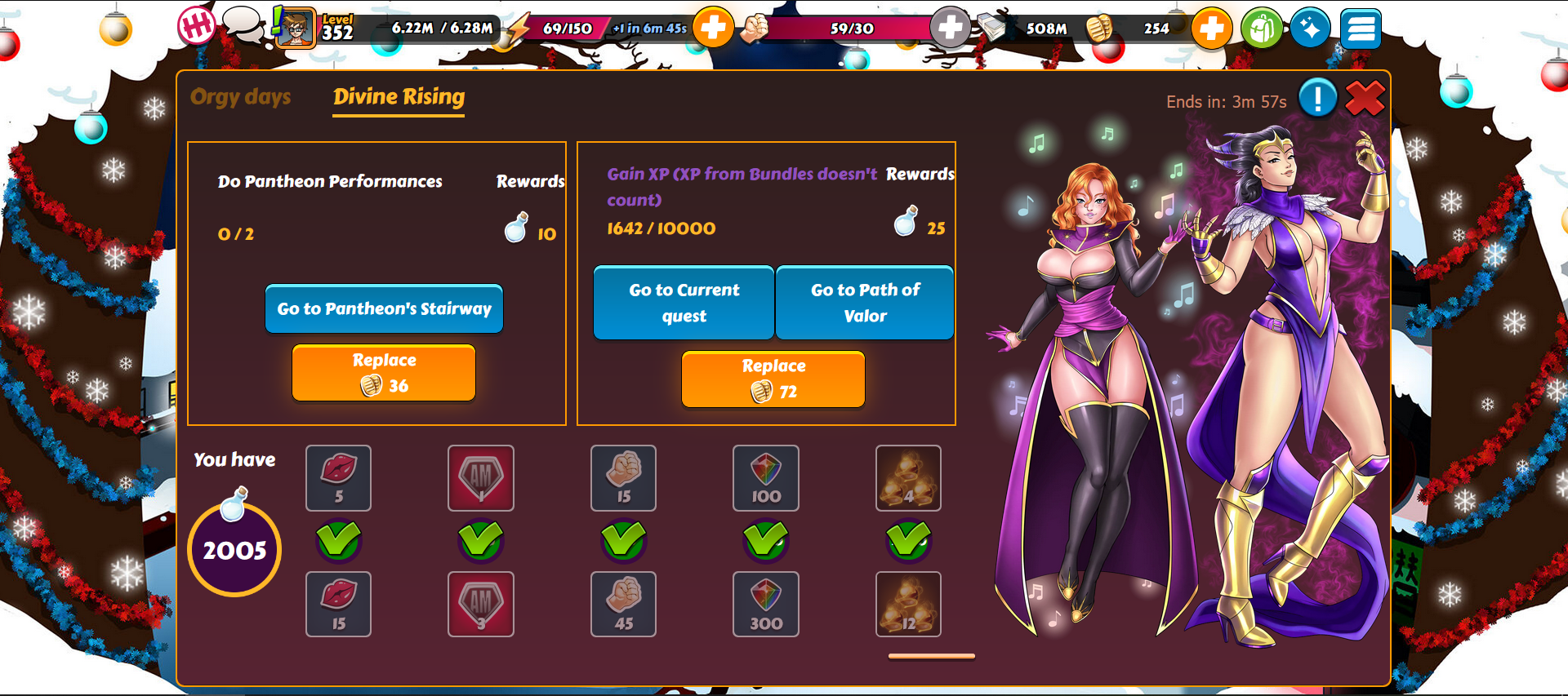 EpicBacon Posted December 16, 2023 Share Posted December 16, 2023 1 hour ago, OmerB said: BTW guys, and especially @DvDivXXX, are you using 'auto-assign all' for the PoPs? I discovered it recently, it's very nive when I'm having plenty of kobans. If you have enough Kobans, then something has gone horrible wrong somewhere :O It's not like I don't understand you tho, I have used the "collect girl money" button in the past, and I sometimes use the 10xvillain performance button when I am either in a hurry or just absolutely sick of clicking buttons. As for PoP, no, I've never used that button, I don't know if this has been fixed, but I seem to recall someone saying there was a bug or something with that button it had a limited number of girls in the pool when you used it, and if you had really high PoPs, especially if you had many of the same element, they would not be filled up completely and some of the timers would be longer then the other. I don't know if this is a problem still, if its been fixed, or if this was when we had higher level pops due to level increase. I just remember there being something with the auto-assign. Now when I do my PoP missions, I do them 1 at a time, I claim, I auto assign, and I start them, then moving on to the next. I used to run out of girls sometimes, especially when I got like 5 temp hc missions in a cycle, but it seems to have fixed itself when I started doing this. since the pop only display your stongest girls, and it has a pool limit, it seems when I do it like this; I have more girls availible, as the pop cannot draw from girls allready allocated in the other pop missions. I don't know if what I wrote here made sense so... TL;DR - No. 2 Link to comment Share on other sites More sharing options...