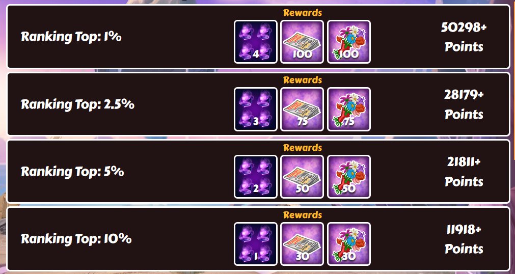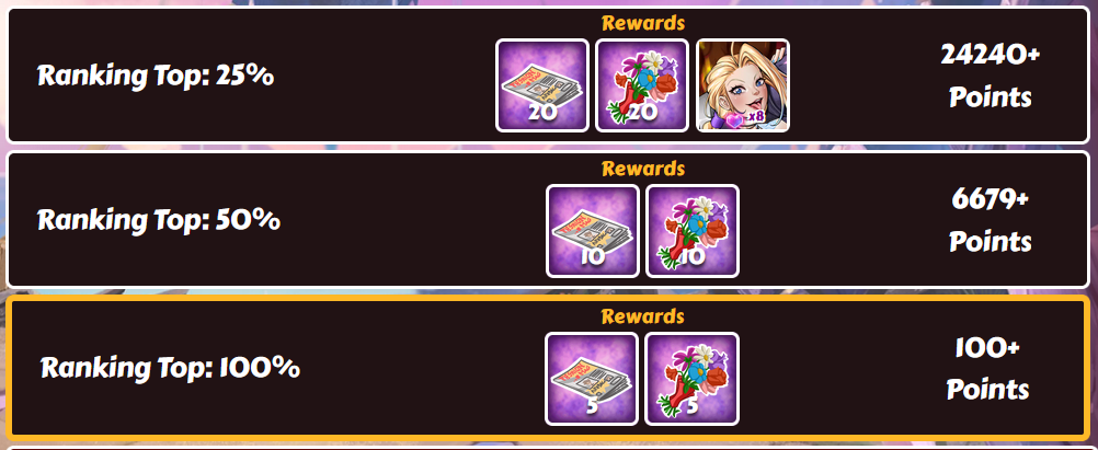 Moderator bolitho76 Posted February 24 Author Moderator Share Posted February 24 World Boss Coop Event (WBC) KK replaced the "new Girl" Variant of WBT with the Coop Event. Like in the original WBT you have to gain points with the same battle mechanic to reach the 4 stages of rewards, but here you have to wait, that the community reach the tiers too, to gain the reward. At the 1st appearance KK had to adjust the community Progress scores 3 times so at least some players would be able to gain the Girl. After the 2nd WBC KK stopped the Event for a full rework. Link to comment Share on other sites More sharing options...