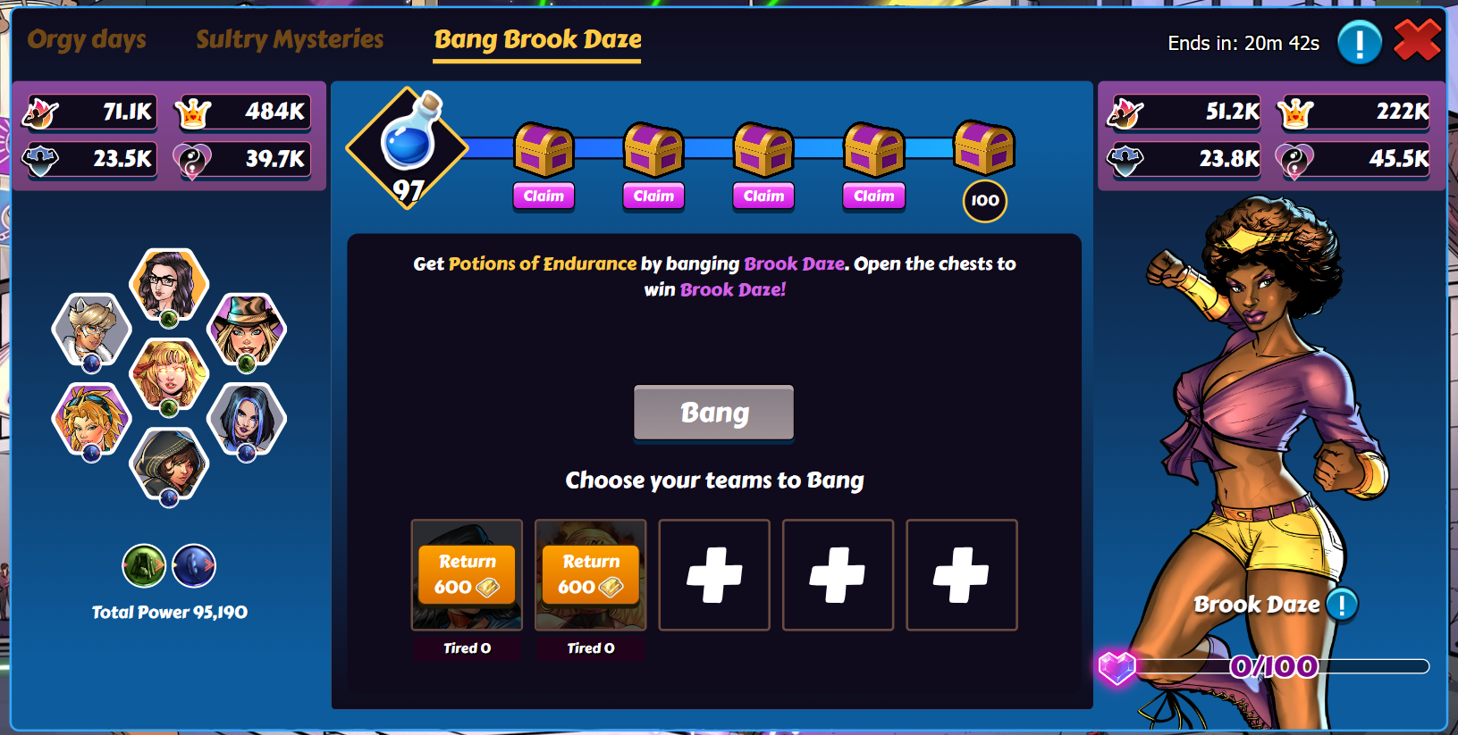 Cuervos Posted March 18, 2024 Share Posted March 18, 2024 1 hour ago, Murton said: I have seduced her with only 1 team, my best heroines around level 690, and that team being 100 % all the way... do you guys think this is normal or maybe a bug? Totally normal, after some level barrier it becomes easy and you just need a single team and to bother clicking the hell out of it to finish it asap. Don't remember when was the last time my first team dropped bellow 99% 1 1 1 Link to comment Share on other sites More sharing options...
