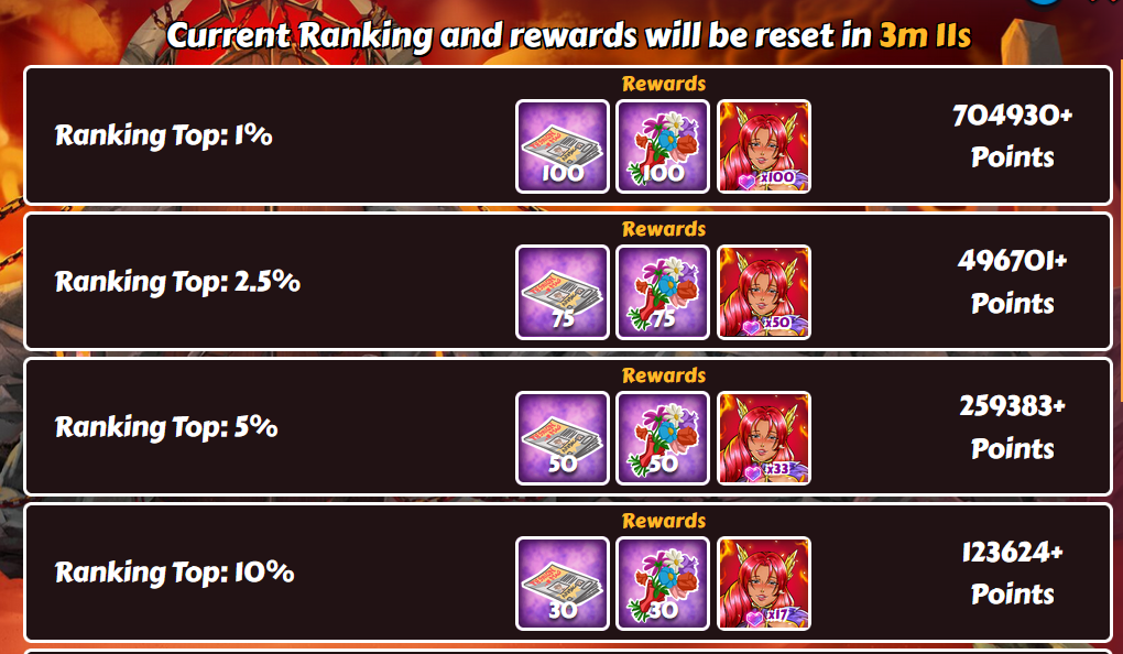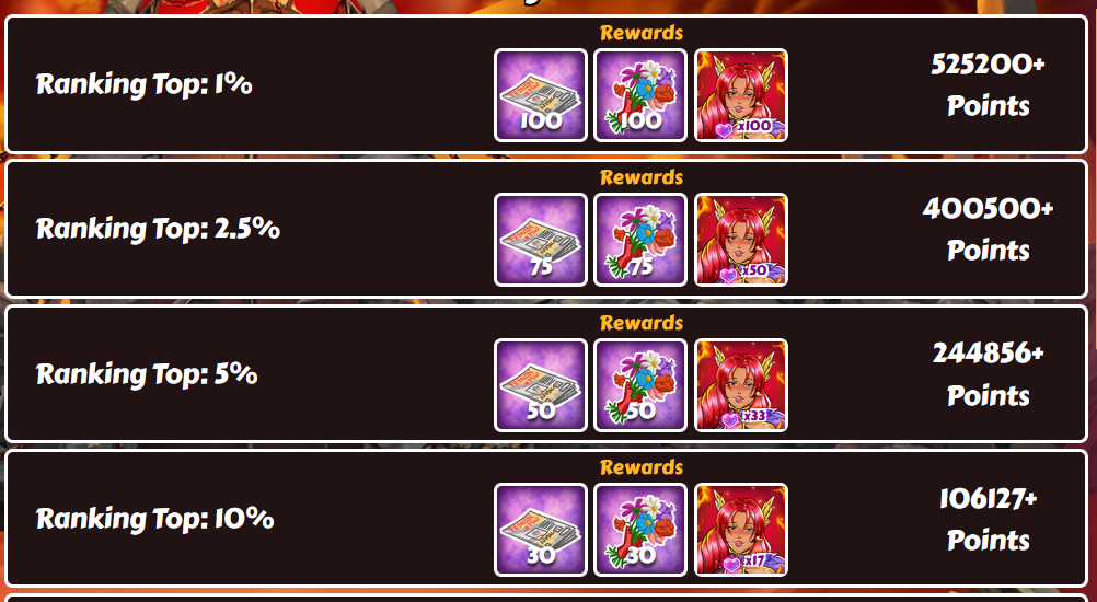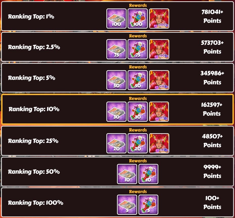 Master-17 Posted July 30, 2025 Share Posted July 30, 2025 9 hours ago, bolitho76 said: Thanks to infarctus we have the score from nutaku: Full ranking So, personal results of the activity: Before the start I had 23 shards On the first day I got into the top 25 (although visually there were more points than needed for the top 10) and got 8 shards On the second day I finally got into the top 10 and got 17 shards Result - 48 shards Were spent: all the stocked frames in the messenger, about 2100 kisses, more than 250 GPx10 and more than 100 MPx1 The question is - was it worth it? Most likely not. Let's see what happens in the next iteration of the activity, if nothing changes - I will not participate anymore 1 1 Link to comment Share on other sites More sharing options...