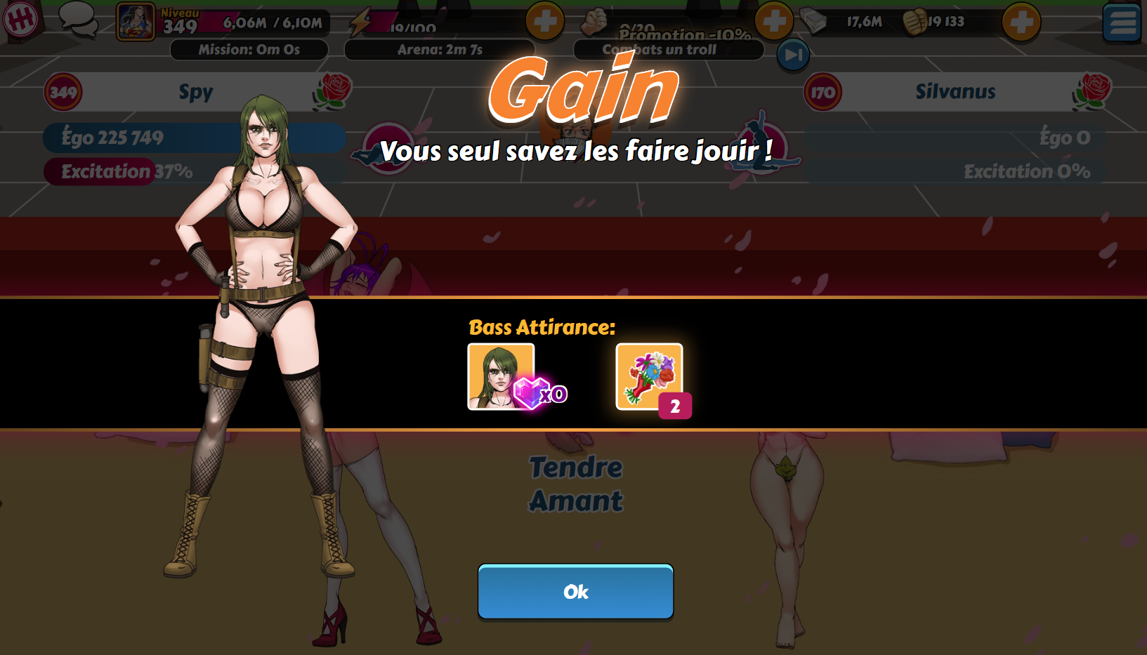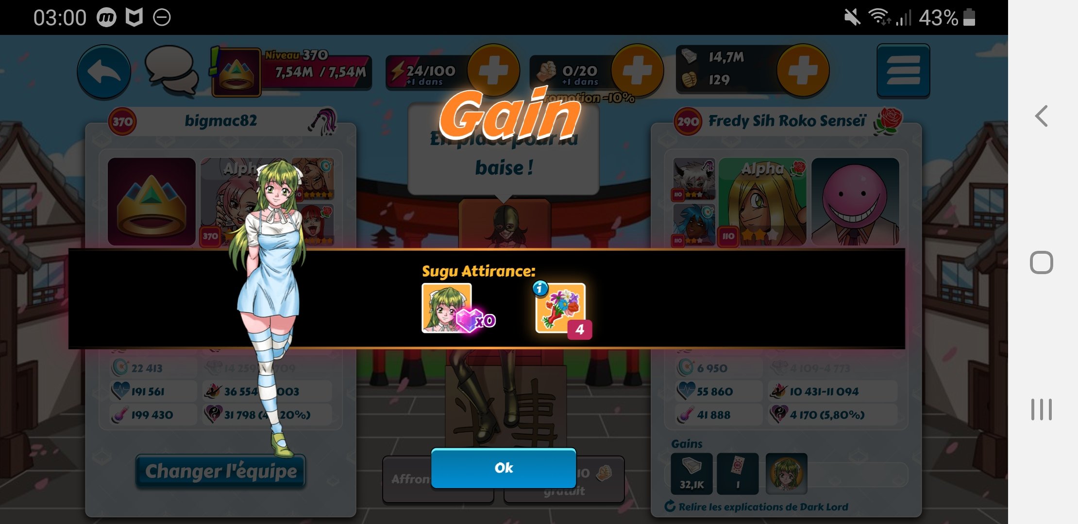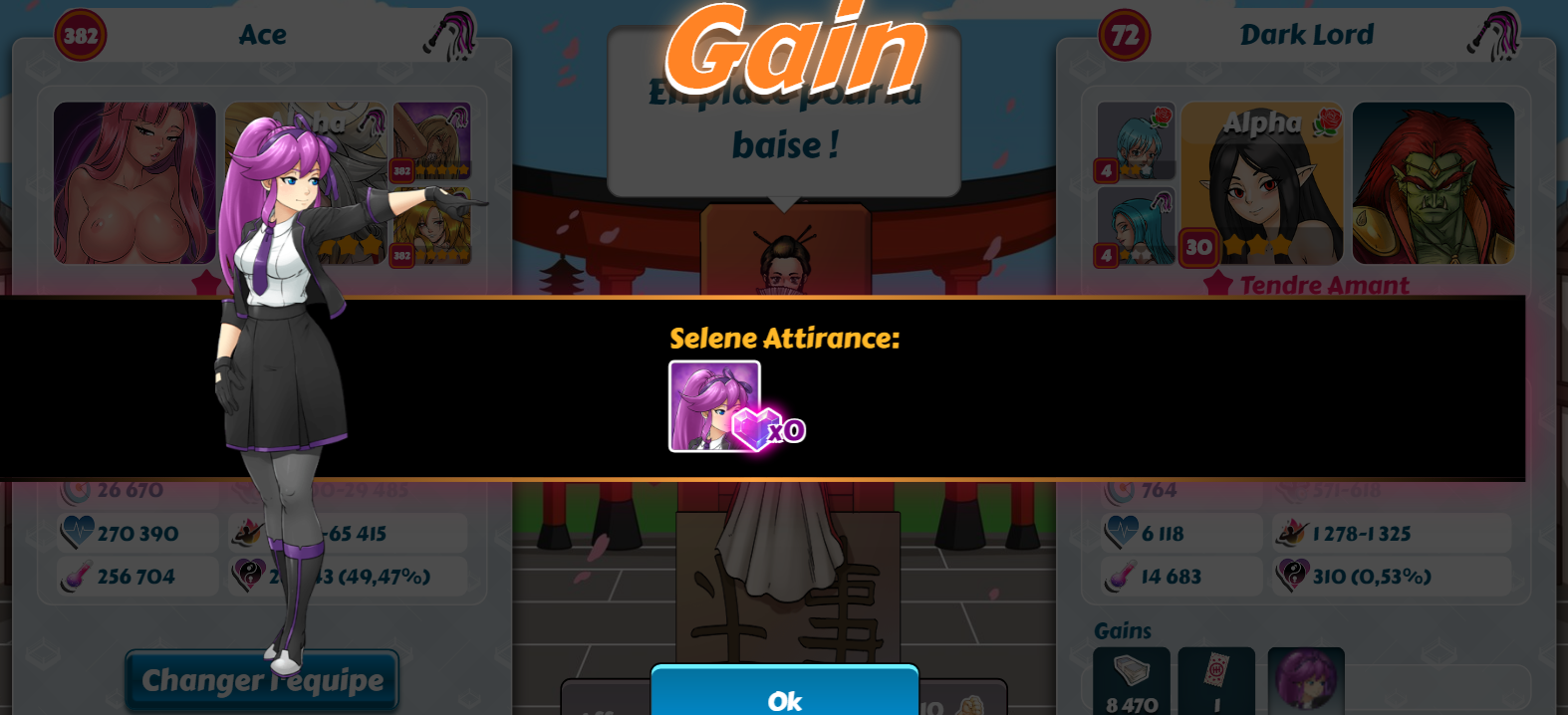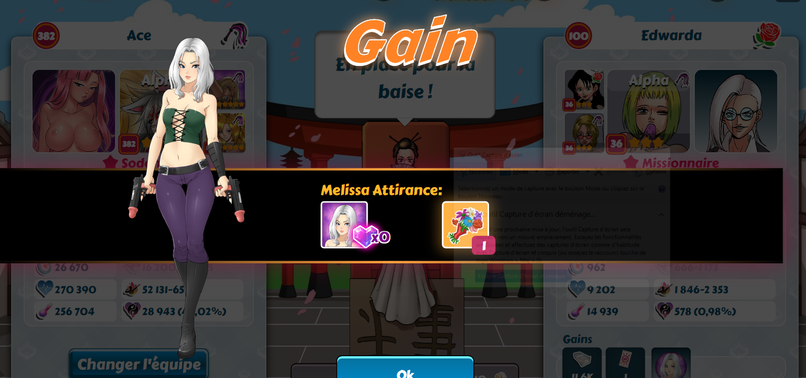 Spy Posted December 20, 2019 Share Posted December 20, 2019 @Ume : C'est jouable sans carte bleue quand on cumule ses kobans pendant des mois. Même sans participer aux ligues. Là, j'ai fait des réserves depuis le dernier anniversaire. Mon objectif était d'avoir une fille pour moins de 5 400 kobans. J'ai voulu tester sur Dark Lord avec la nouvelle version de Zeld... Agathe et Selene. 3 440 kobans pour elle. Et j'ai avancé l'autre fille à 92 cristaux. Avec Dark Lord au palier 2 niveau 69, je devrais atteindre son troisième palier lors du prochain événement et ainsi être en mesure de recruter Midona / Espérance. Sugu et Kyoto sont déjà dans mon harem (pachinko épique X10 durant l'anniversaire si ma mémoire est bonne). Il me reste actuellement Mélissa, Windia et Bass à obtenir. Pour Windia, je verrai selon la "concurrence" de Xia, nouvellement ajoutée sur Donatien. Après test, même avec une autre fille, une haremette est toujours plus rentable avec recharges que via le pachinko épique (X10). Link to comment Share on other sites More sharing options...