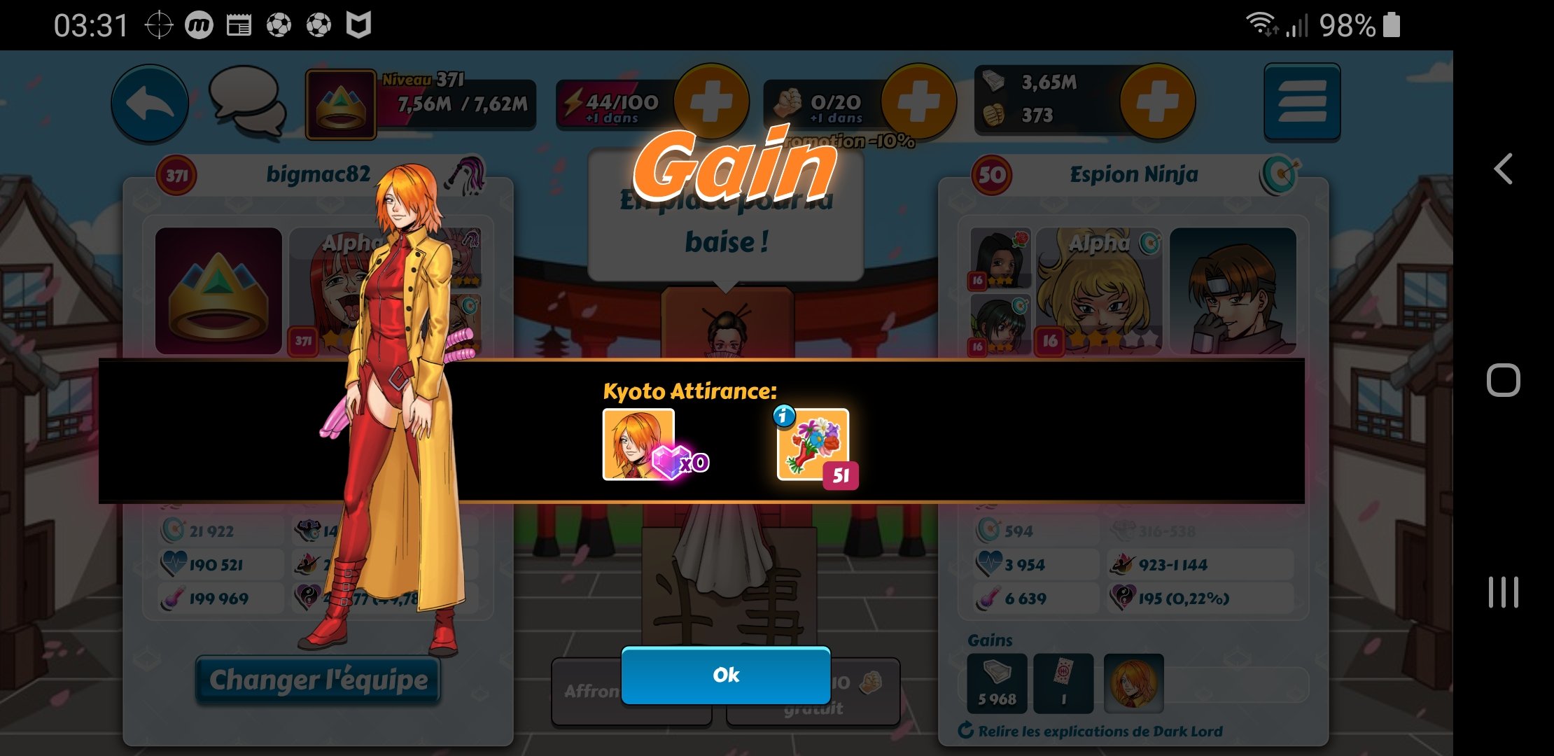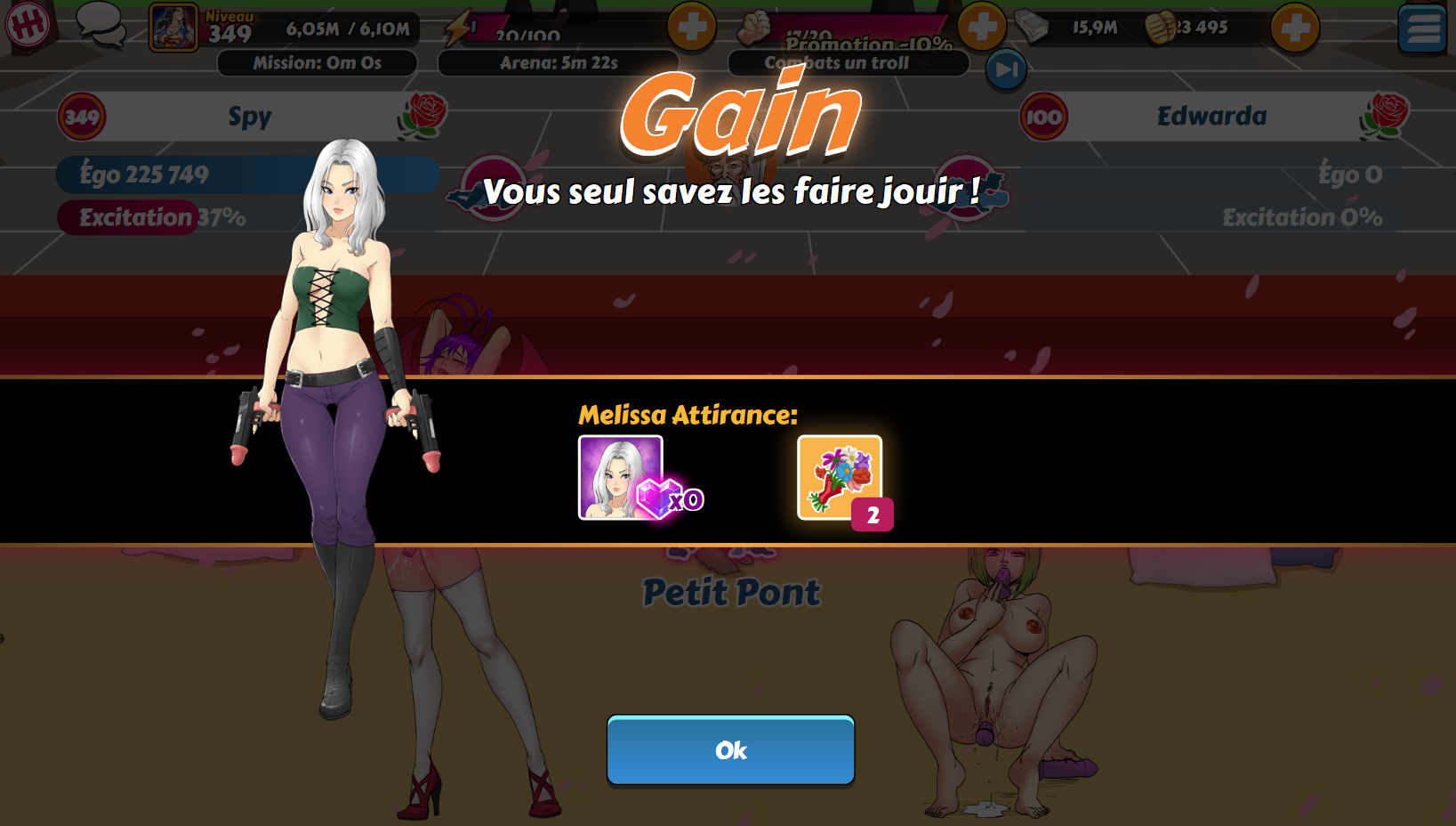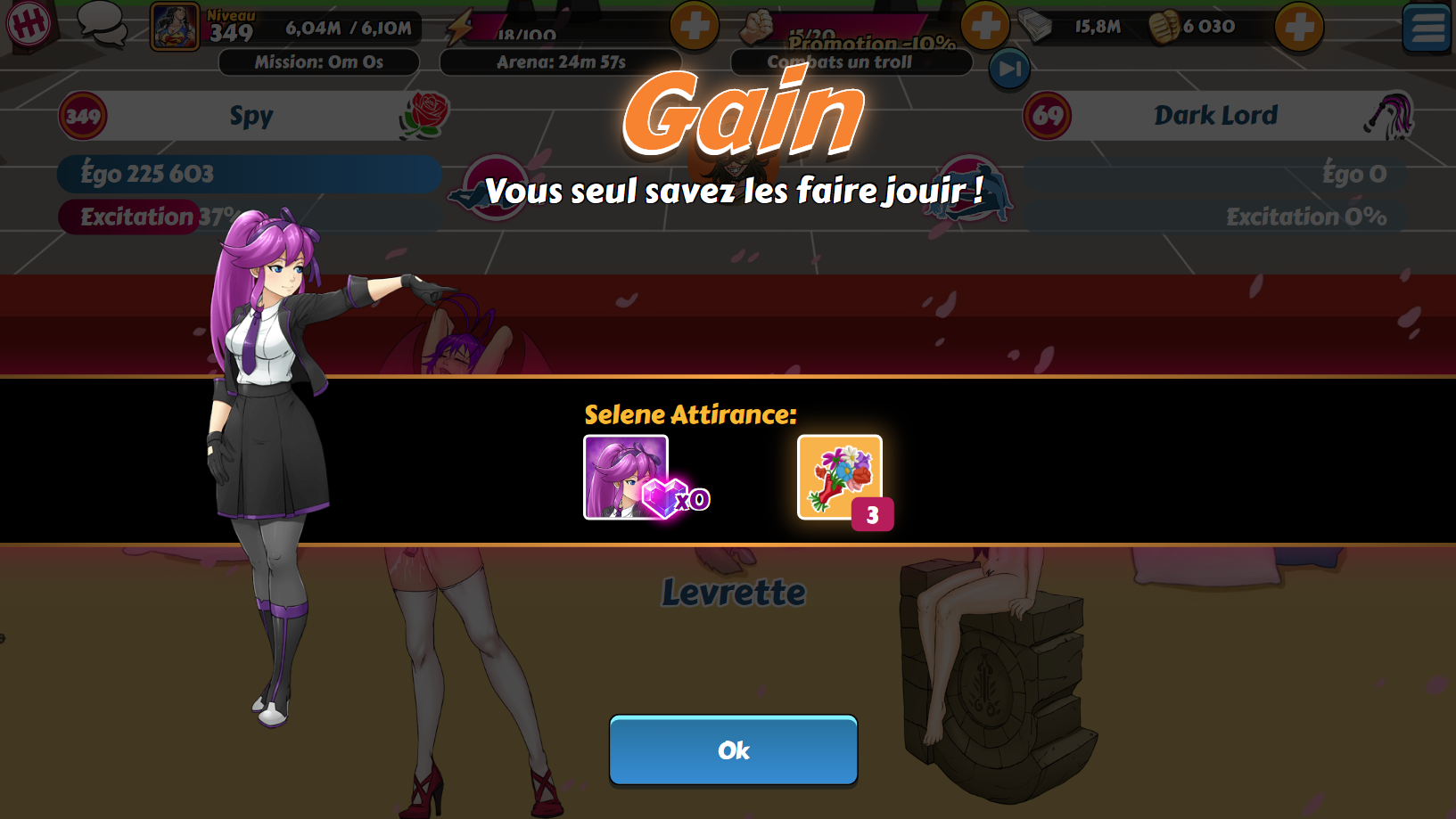 Spy Posted December 20, 2019 Share Posted December 20, 2019 @Ume : C'est jouable sans carte bleue quand on cumule ses kobans pendant des mois. Même sans participer aux ligues. Là, j'ai fait des réserves depuis le dernier anniversaire. Mon objectif était d'avoir une fille pour moins de 5 400 kobans. J'ai voulu tester sur Dark Lord avec la nouvelle version de Zeld... Agathe et Selene. 3 440 kobans pour elle. Et j'ai avancé l'autre fille à 92 cristaux. Avec Dark Lord au palier 2 niveau 69, je devrais atteindre son troisième palier lors du prochain événement et ainsi être en mesure de recruter Midona / Espérance. Sugu et Kyoto sont déjà dans mon harem (pachinko épique X10 durant l'anniversaire si ma mémoire est bonne). Il me reste actuellement Mélissa, Windia et Bass à obtenir. Pour Windia, je verrai selon la "concurrence" de Xia, nouvellement ajoutée sur Donatien. Après test, même avec une autre fille, une haremette est toujours plus rentable avec recharges que via le pachinko épique (X10). Link to comment Share on other sites More sharing options...